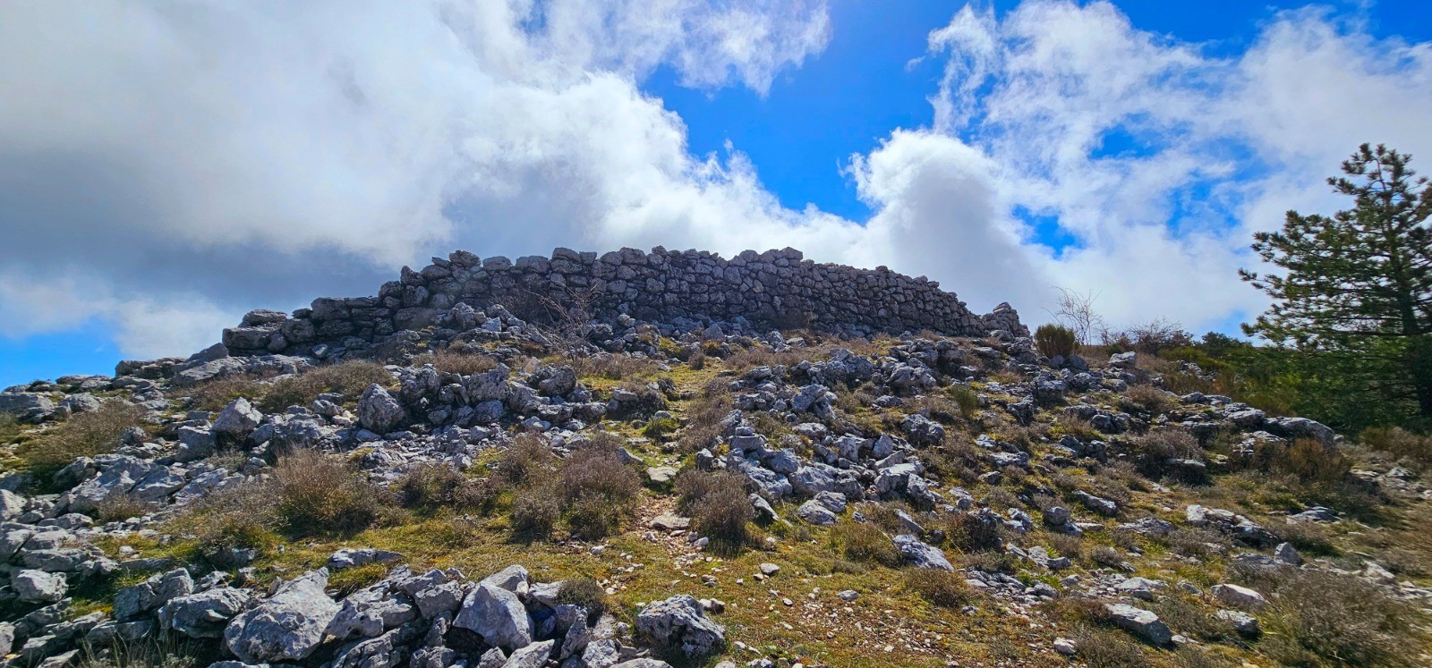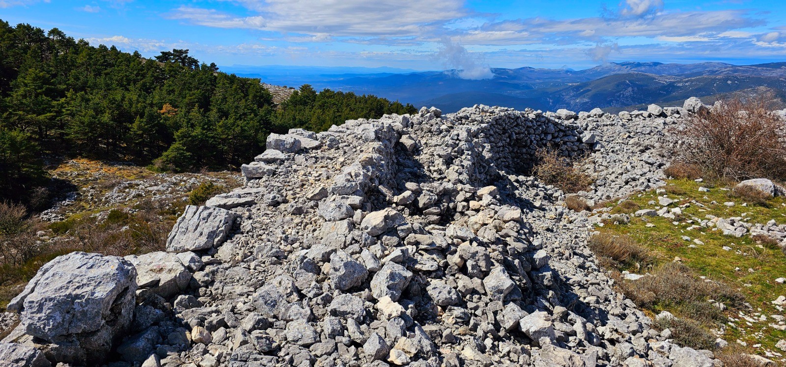 Emprunter le chemin débutant à hauteur du pylône du col et se diriger vers l'est en délaissant la 1ère bifurcation à droite (chemin de retour). Intersection en patte-d'oie 110 m plus loin. Prendre la sente située à votre gauche qui va sinuer sur ligne de crête jusqu'à la balise 64 en passant par les points côtés 998 et 1027. Beau panorama avec sentier que j'ai parcouru par une brume matinale très dense dans une ambiance magique et spectaculaire. Depuis bifurcation balise 64, poursuivre toujours plein est en suivant les points hauts qui jalonnent ce cheminement en crête jusqu'au point côté 1092 (Le Mortier) à partir duquel on amorce une agréable descente jusqu'au col du Ferrier (balise 61). 1ère portion de cet itinéraire par belle sente "cairnée" avec alternance marquage jaune, exigeant sens aigu de l'orientation. Phase ascensionnelle modérée du col du Ferrier au Castellaras de la Malle (2,55 km pour d+ 174 m) par sentier bien marqué longeant plusieurs bories et vestige d'abri ligure. Traversée d'un bois de pins sylvestres avant de découvrir le Castellaras et ses caractéristiques remarquables : enceinte en arc de cercle sur à-pic avec mur de soutènement sur rempart de 4 m de large pour 5 m hauteur maximale, pour surface de 108 m de long et 31 m de large avec 2 portes d'accès au nord et au sud contre l'à-pic.