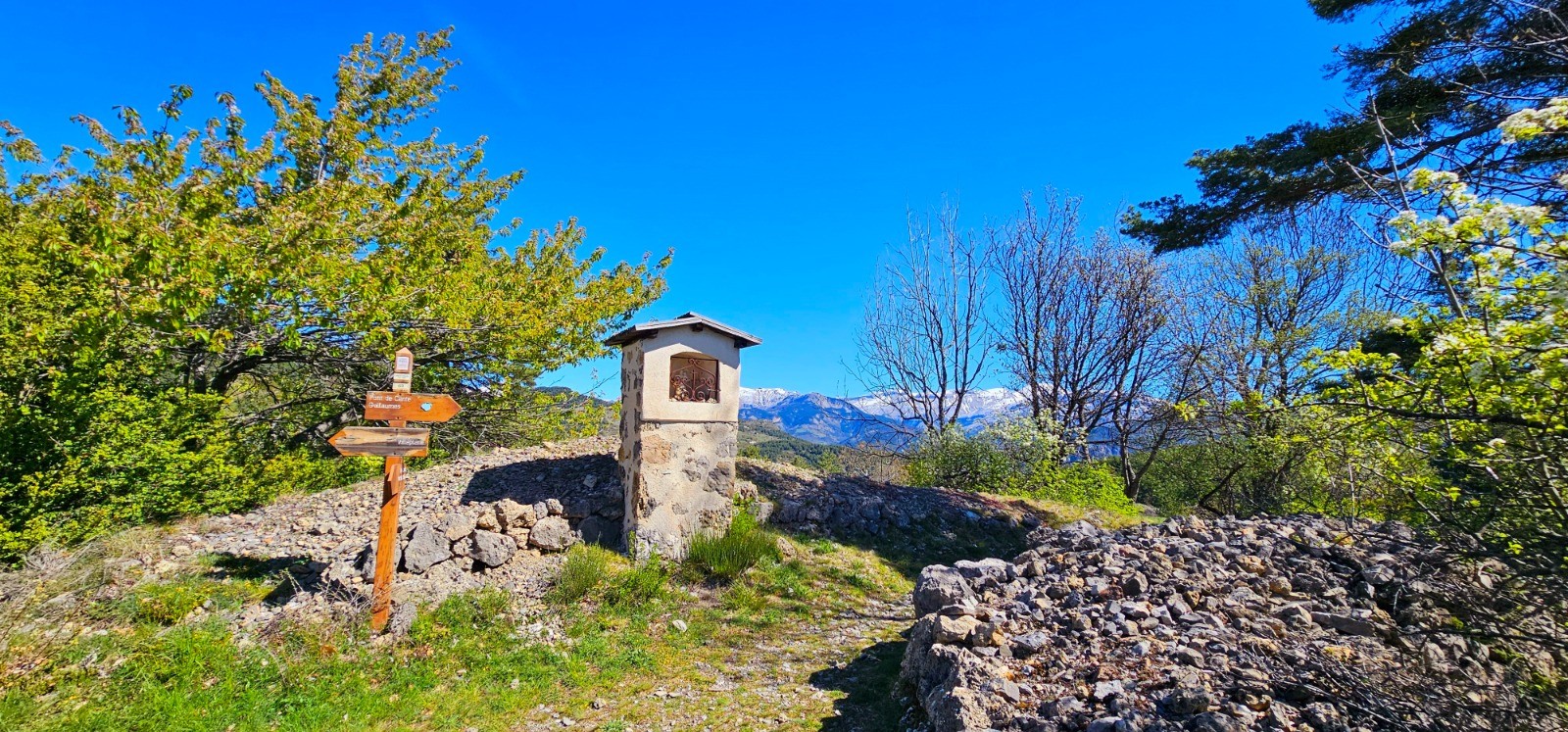 Changement de décor après la B 6 avec ascension à travers forêt de chênes pubescents jusqu'aux campagnes et hameaux successifs de Saussette, des Terrassettes et de Sauze Vieux par bel itinéraire avec marquage jaune. Depuis la B 89 de Sauze Vieux, prendre plein nord en direction de la chapelle Saint-Joseph jusqu'à une zone de coupe de bois avec une table de pique-nique, en bordure de route (km 12,86). Le chemin qui mène au mont Richarmet (bref aller-retour) ne fait l'objet d'aucune indication. Il convient de prendre une sente bien marquée qui débute à hauteur de la table de pique-nique précitée. Sommet de moyenne montagne offrant de belles perspectives sur le vallon du Var et sur le village de Guillaumes situé en contrebas, avec magnifique panorama sur la chaîne enneigée du Mercantour et sur le mont Saint-Honorat qui se découpe à l'ouest.
