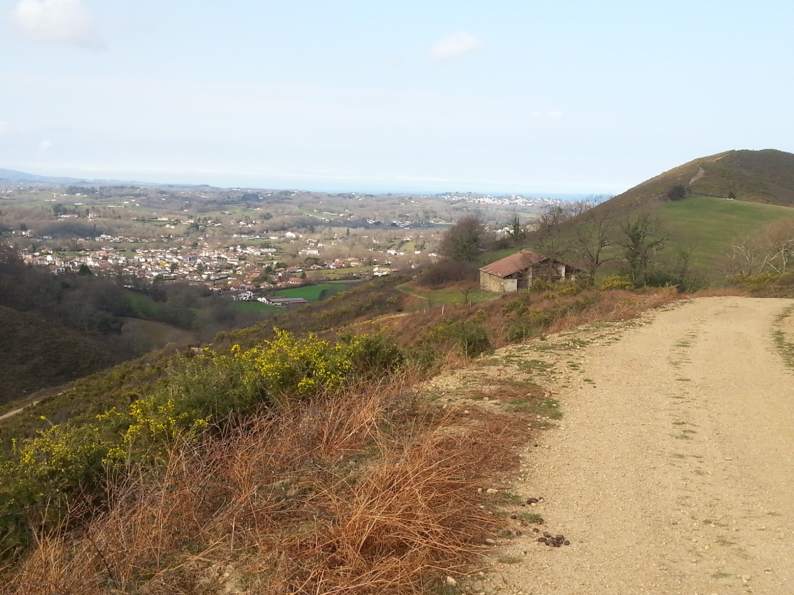 Pour reprendre le chemin depuis Espelette, monter vers le centre du bourg, sur la rue principale ( Karrika nagusia) prendre la deuxième à gauche ( Xerri karrika) puis la première à droite Xurikiko bidea et se diriger vers la passerelle au dessus de la D 918. Après la passerelle prendre la première à gauche ,puis tout de suite la première à droite Oilakineko bidea en continuelle montée jusqu au col de Pinodieta ( 3.5 km )ou l on retrouve le GR 8 et la voie directe depuis Bidarray( croisement avec la voie du Baztan; traverser la D20 et suivre en face le balisage GR ( rouge et blanc) sur la longue ligne de crête, ( belles vues ). Une première descente parvient à un col; départ de la VARIANTE St PEE SUR NIVELLE ( panneau signalétique) ,elle mène en 5.700km au centre ville (Refuge pèlerin derrière le presbytère prés de la mairie, s adresser à l OT). La variante continue ensuite par le pont Romain situé derrière l église , puis en suivant le cours de la Nivelle sur 500 mt: après le passage sous la D 918 , prendre à gauche vers le quartier Urguri que l on traverse par le chemin de Zaldubia, en se dirigeant vers les collines et le mont Zuhalmendi ou l on rejoint l itinéraire principal après 5km . Au départ de la variante St Pée s/Nivelle , on peut aussi continuer sur le GR 8 en montée, puis sur une longue descente vers le pont d Amotz ( 10.4km depuis Espelette) suivre à droite la D3 sur 300métres et prendre la première petite route à gauche, qui monte vers les hauteurs de Sare . Au bout de 3km500, peu après la jonction de la variante St Pée s/Nivelle, on arrive en vue d une hauteur à gauche (redoute de Zuhalmendi) on abandonne le GR8 qui monte à gauche vers le sommet et descend en direction de Sare. Contourner le sommet par la droite et au premier carrefour ( élevage de porcs Basques) suivre à droite la longue piste qui descend vers le bourg d Ascain ( 18 .350 km depuis Espelette) Arrivé à la fin de la descente, continuer tout droit, passer devant le camping Chourio, après le fronton suivre la rue à gauche jusqu au parking derrière l église, monter vers l église.