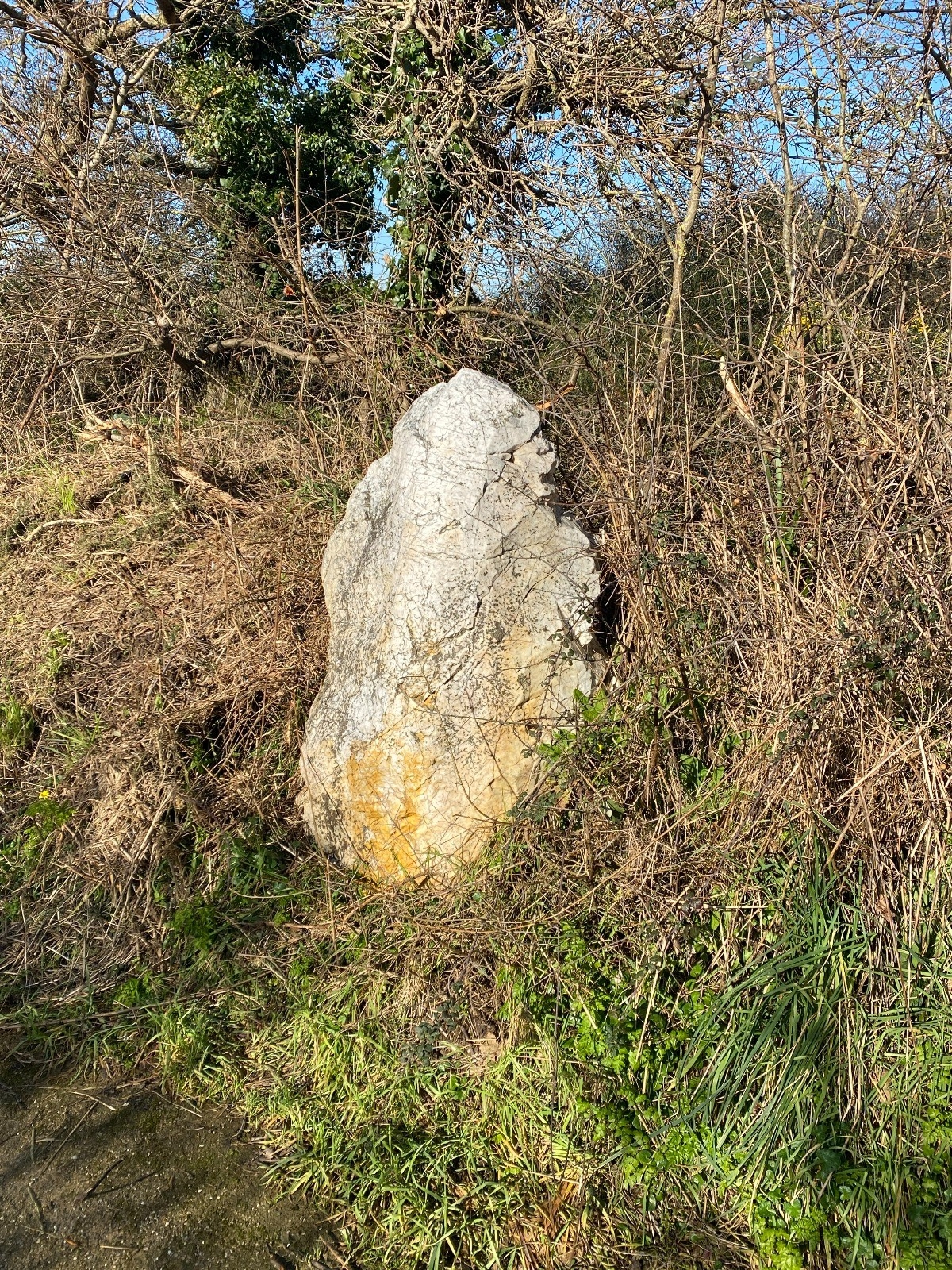 Kilomètre 3 : Le Menhir de l'Ennerie ( photo no 6 ) qui nous surprend par la blancheur de son quartz.