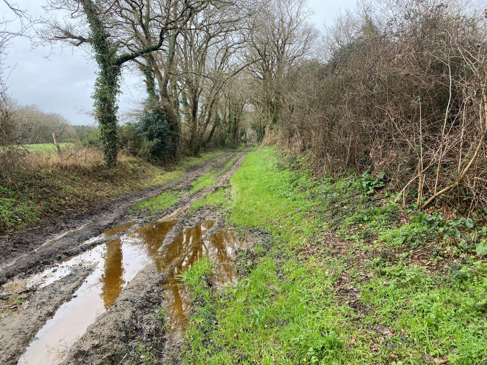 Un gros kilomètre et nous voilà à La Bourrelière, un chemin bien boueux prend le relais du macadam.
