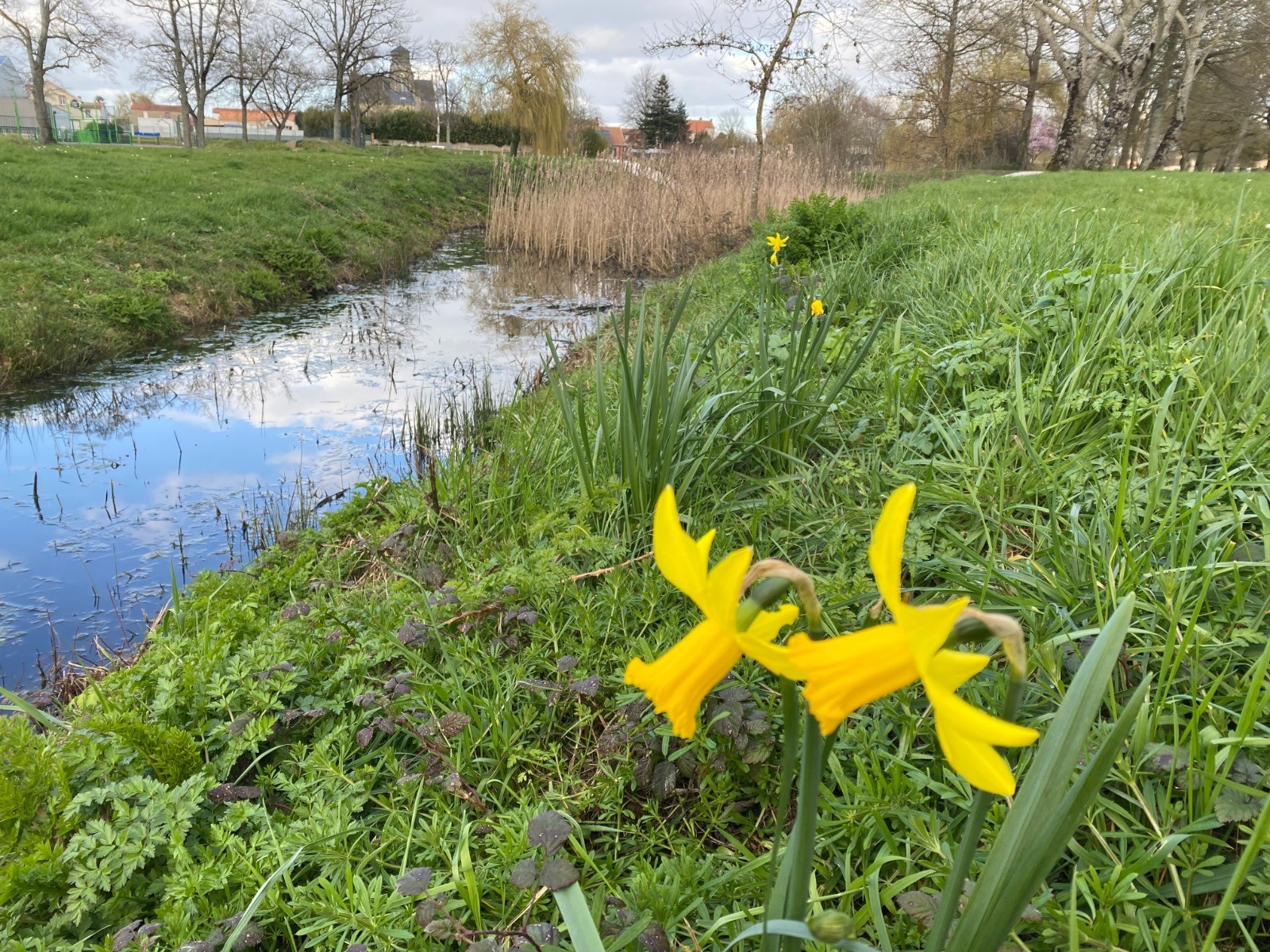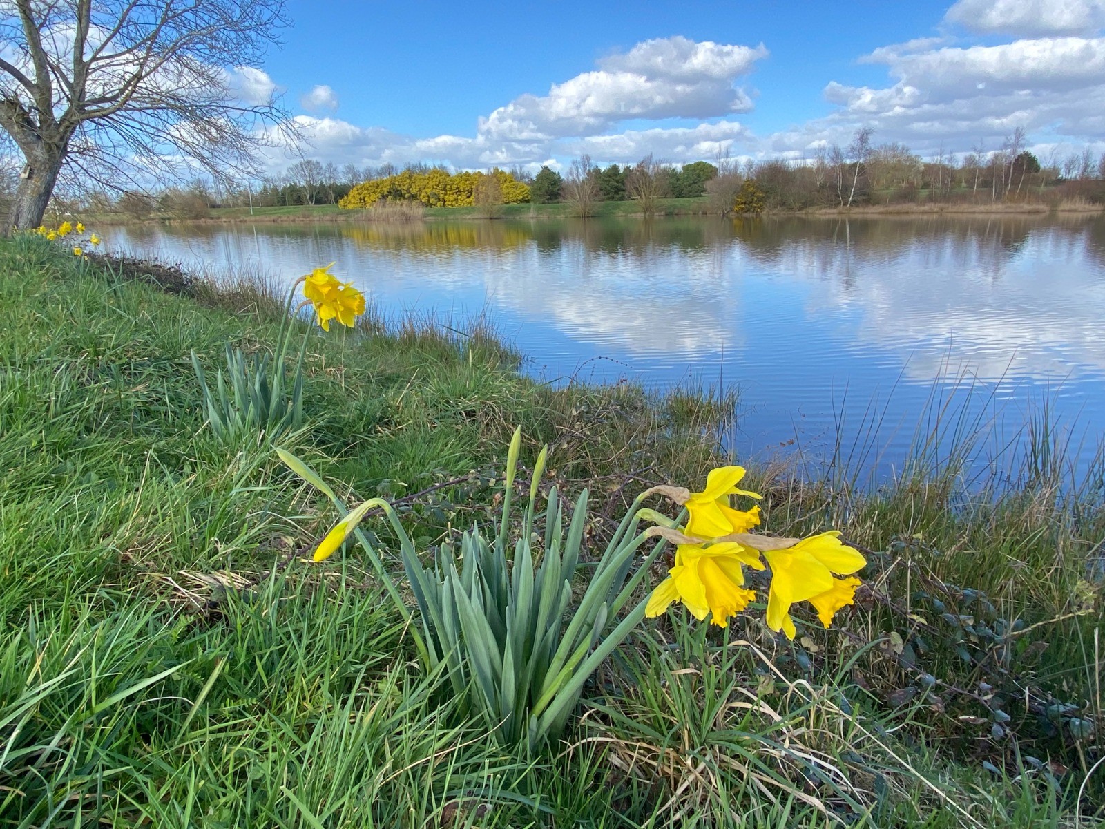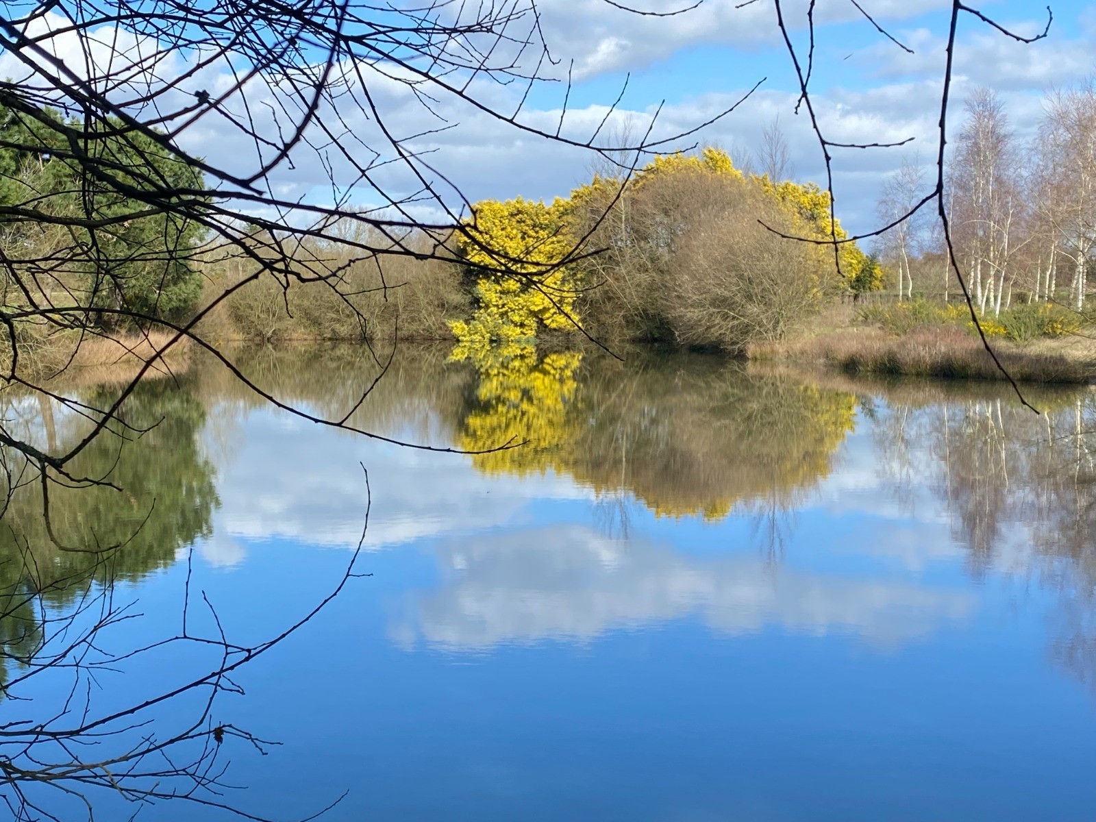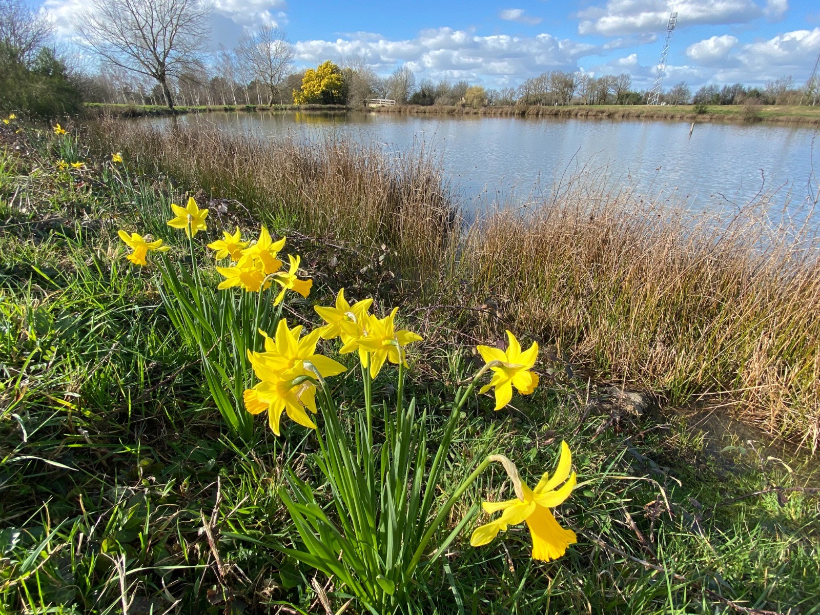 Aujourd'hui tout est réuni pour que le paysage soit grandiose : le soleil, un ciel bleu clair avec quelques nuages, une forêt de mimosas, des bouquets de jonquilles... cela laisse place à de belles photos avec reflets dans l'eau.