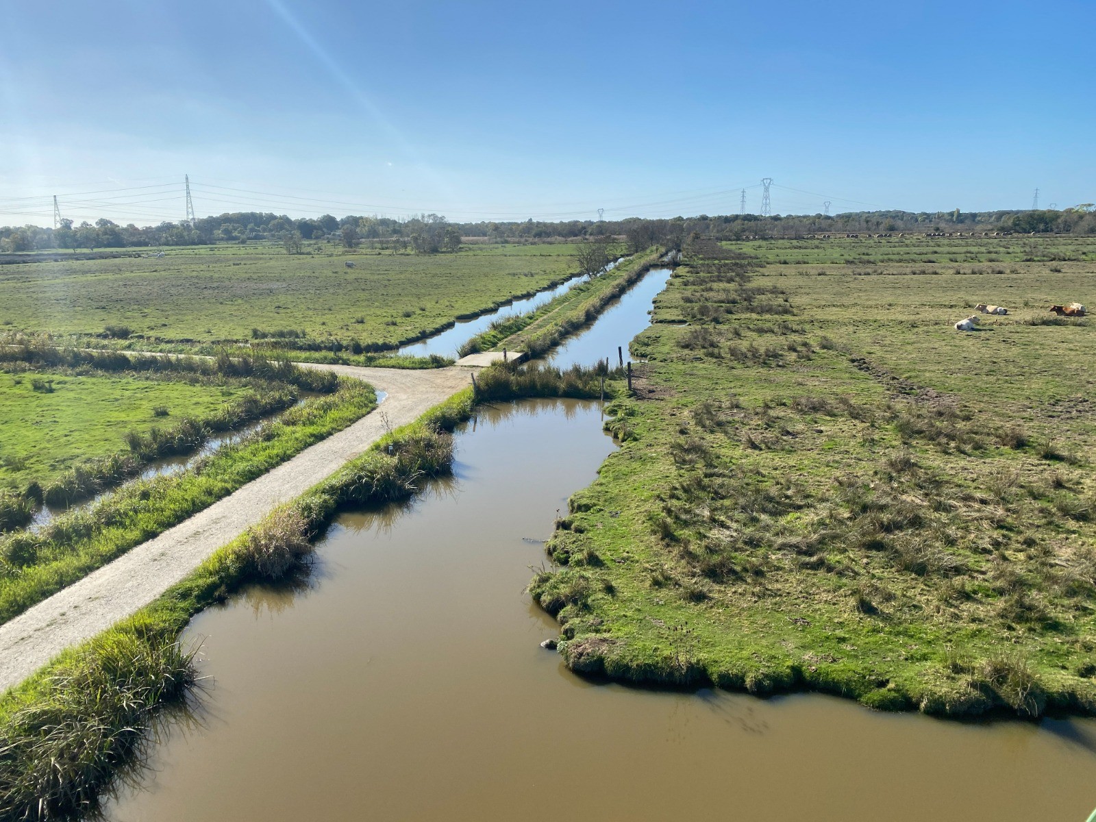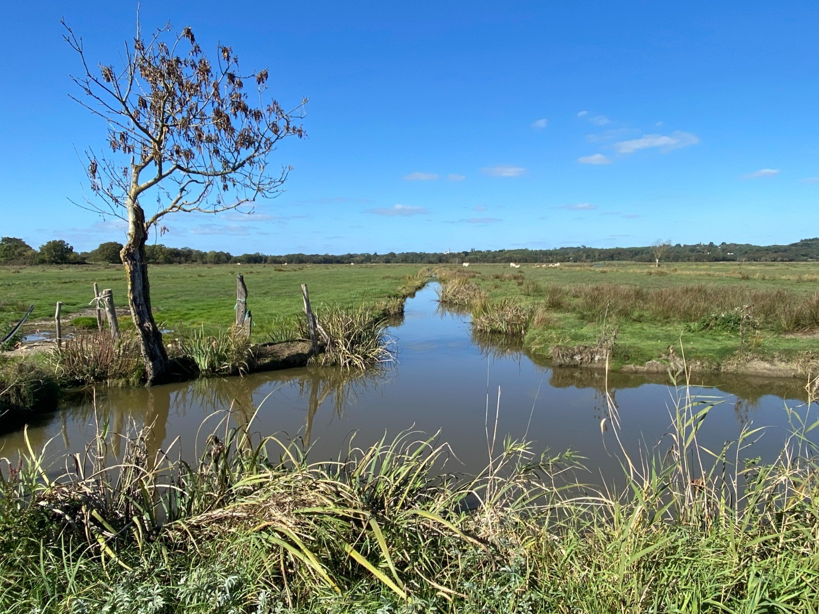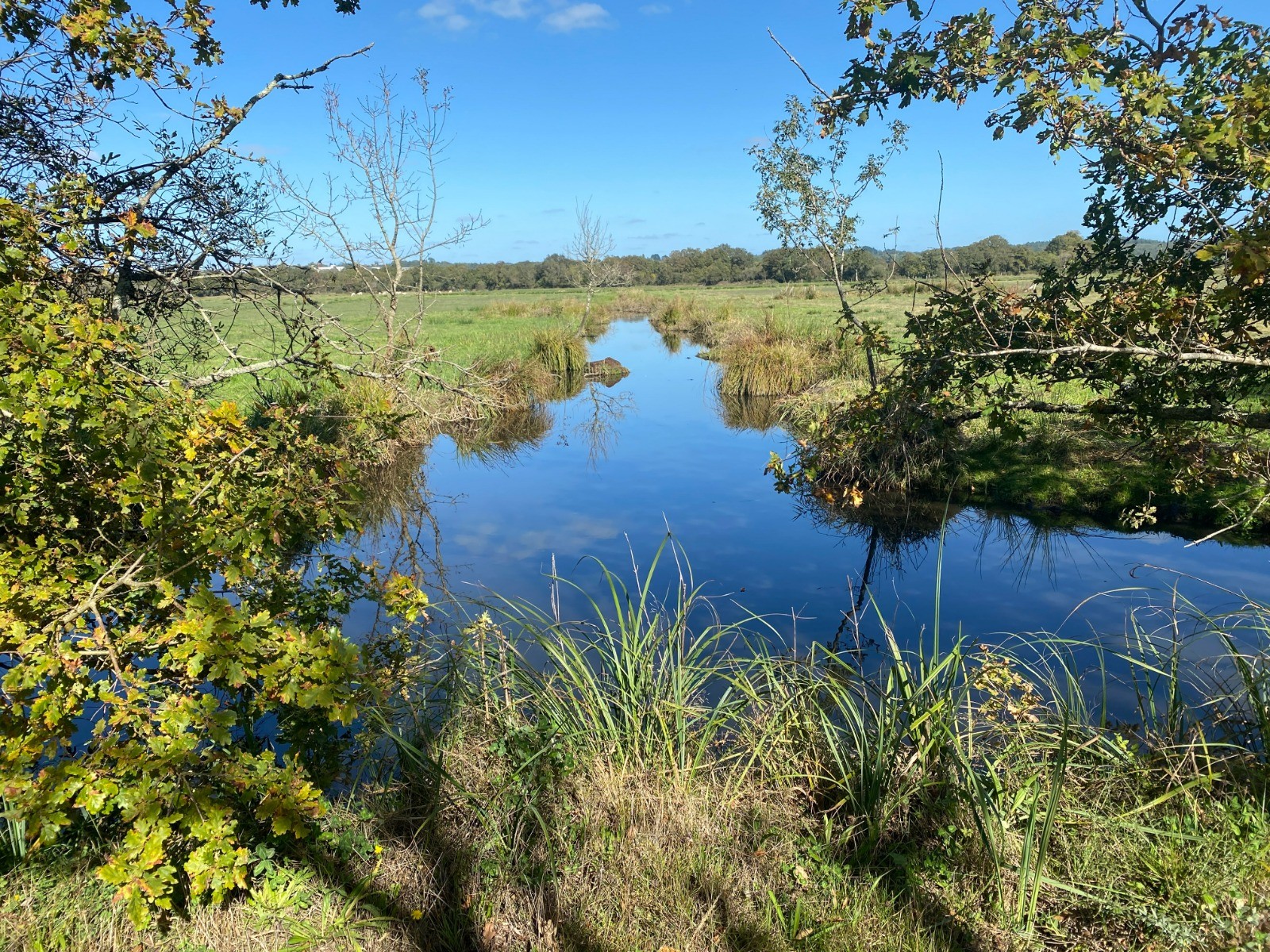 Le chemin de retour passe ensuite par le marais du Pré, un paysage plus ouvert où les prairies humides alternent avec de petits fossés bordés de saules.