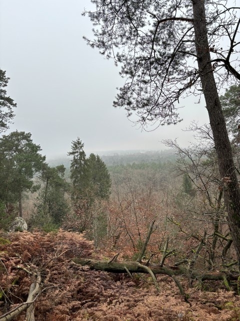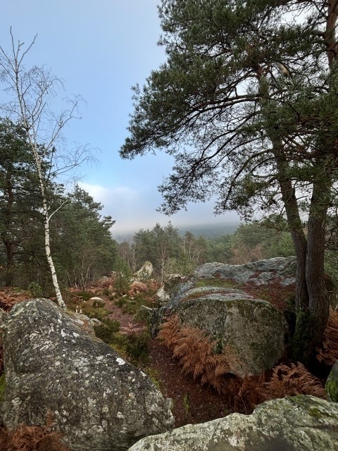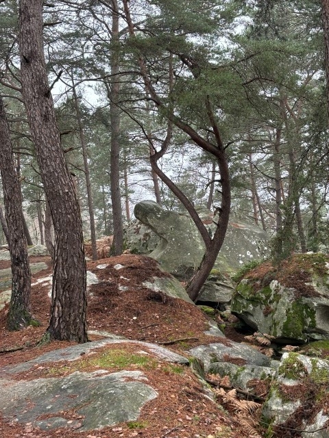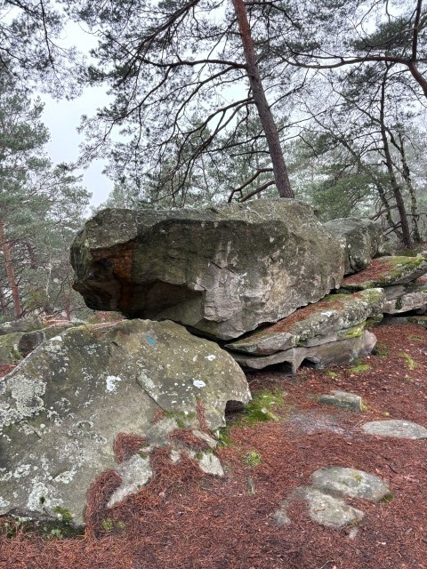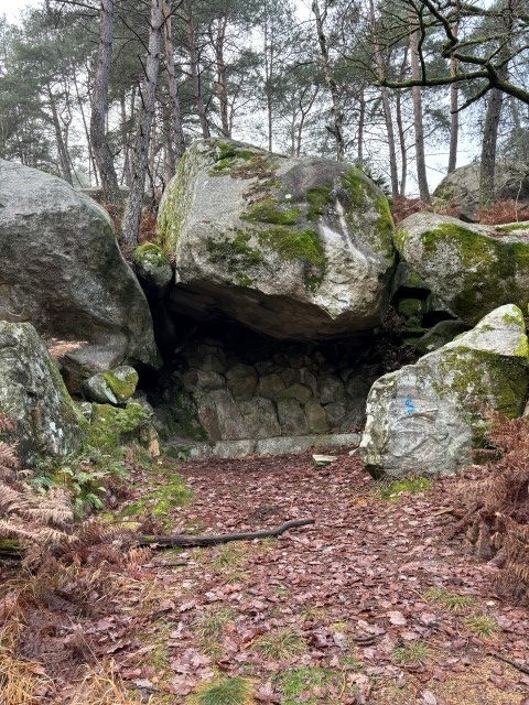 6 – Passer entre les deux blocs et accéder au point de vue sur Fontainebleau et un peu en retrait le rocher de Léonard de Vinci (*) sur le droite, en continuant sur votre gauche un superbe pin en Lyre avec son rond bleu, poursuivre en passant le passage des sept roches (C), continuer par le puits du Diable (*) énorme trou dans un bloc, sur votre droite le rocher de Louis Lépine(*) et en face sur la colline un bloc en biais dît le rocher du Bon Paul, plus loin la grotte de Lord Byron (*) et la roche Lacontrie (B) et sortir de nouveau sur la route d’Occident.