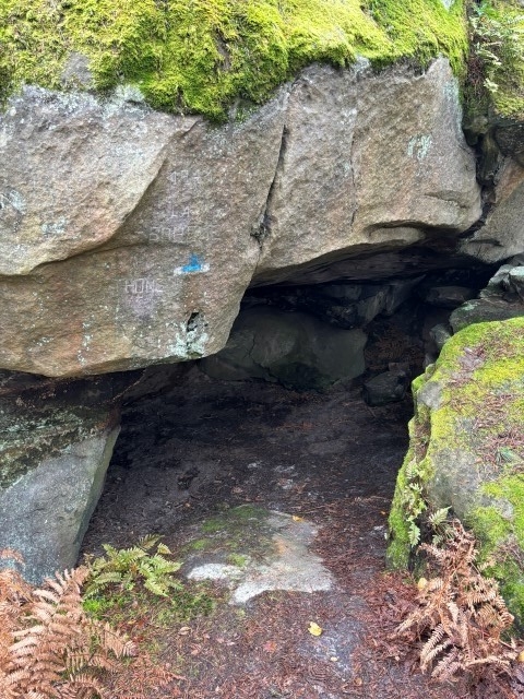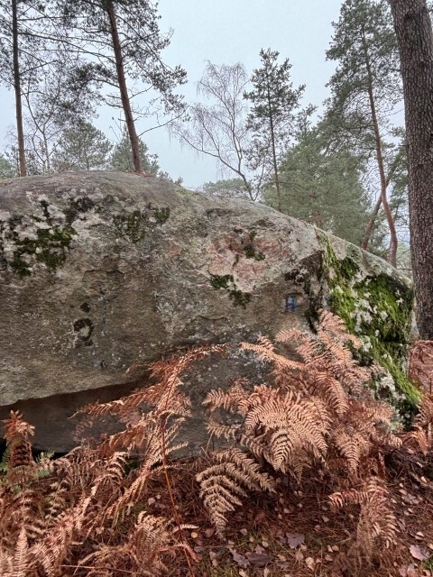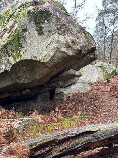 4 – Revenir sur le sentier bleu et continuer celui-ci pour découvrir successivement une multitude des blocs auxquelles Denecourt donna des noms : La pieuvre des Rochers (N), le Petit Sphinx de Bouligny (*) au milieu du chemin, plus loin la grotte Decamp (M), sur la droite encore plus loin le Crapaud de Bouligny (L) et en face la Roche à deux Têtes(*) en continuant sur la platière devant la Licorne (K) et plus bas la Caverne du Sycophante (J) un peu plus loin le banc du Sphinx (I) et en passant le sentier le rocher de Luchet (H).