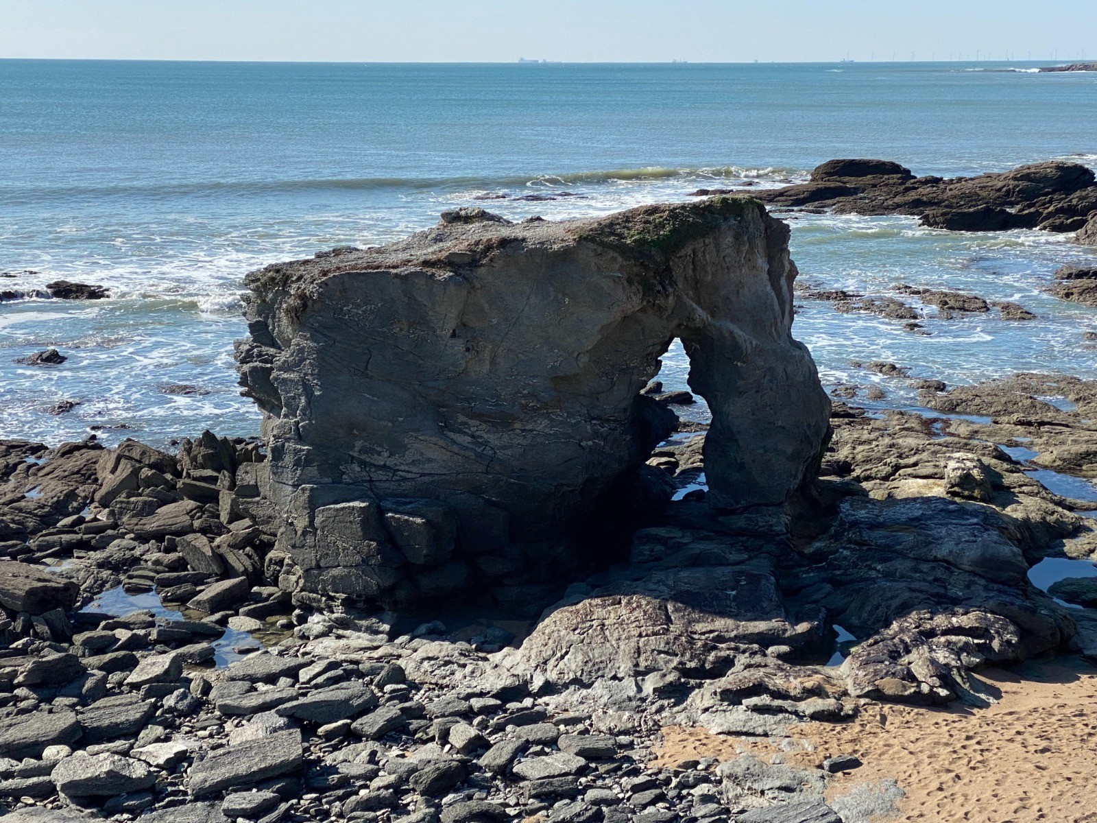 La mer est légèrement agitée et de nombreux rouleaux viennent s'écraser sur les rochers.