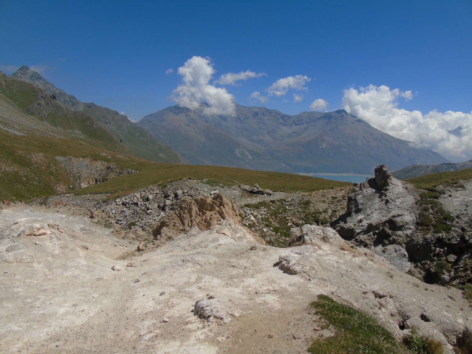 Au croisement à 2445m (un petit lago sous l’arête SW du signal du Petit Mont Cenis), prendre main gauche le single qui part plein E, et traverse la zone de gypses blanc. Là aussi c’est magnifique, quelques pas un peu techniques mais rien de méchant.