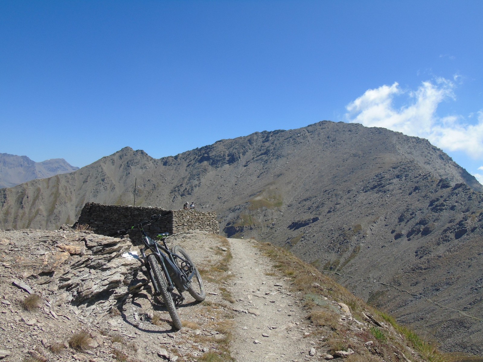 On porte ou pousse le vélo, alors, sur une succession de petits lacets très serrés, mais ça passe bien, puis vers le haut les lacets sont moins serrés. Cela représente en gros 100m D+ jusqu’au fort du Mont Froid (2800m).