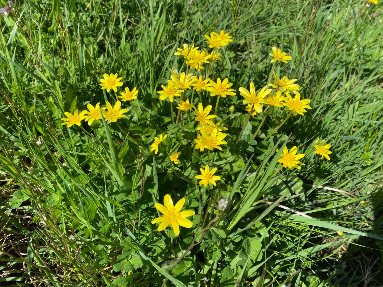 Les "orchis bouffon" ( photo no 1 - sorte d'orchidée ) font leur apparition et les ficaires ( photo no 2 ) forment un ruban jaune de part et d'autre des chemins.