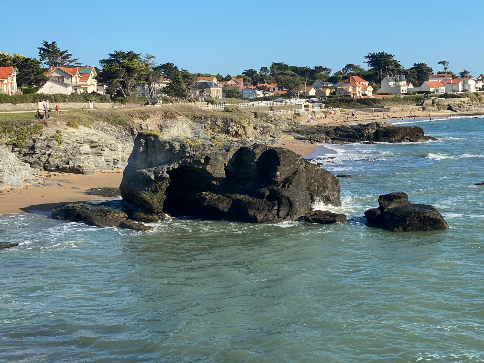 Et juste avant l’arrivée, un dernier spectacle s’offre à nos yeux : à droite du sentier, la silhouette majestueuse de la Roche Percée, véritable emblème de Préfailles.