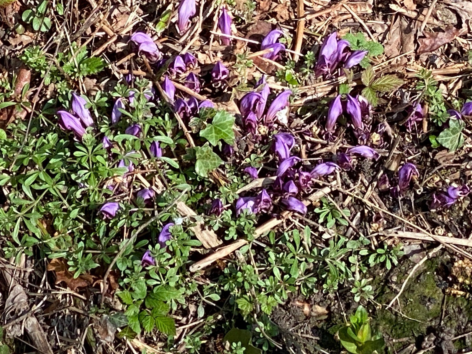 Au bord du petit ruisseau de surprenantes et belles touffes violettes; il s'agit de la "lathrée clandestine"