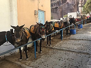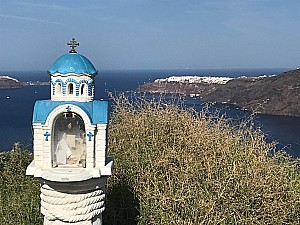 300 mUne partie de Fira non explorée ce matin mais qui vaut un large détour. Comme la randonnée précédente, je suis parti de l'hôtel "Les Cyclades". Fira la ville blanche. Pourquoi est-elle surnommée ainsi : "Les maisons sont peintes en blanc, notamment avec de la chaux, pour des »