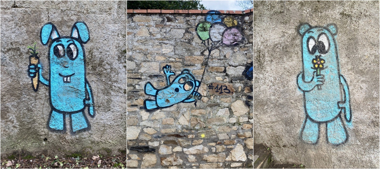 Un grapheur ( photo no 11 ) a peint de nombreux petits hommes bleus ( les Oides ).