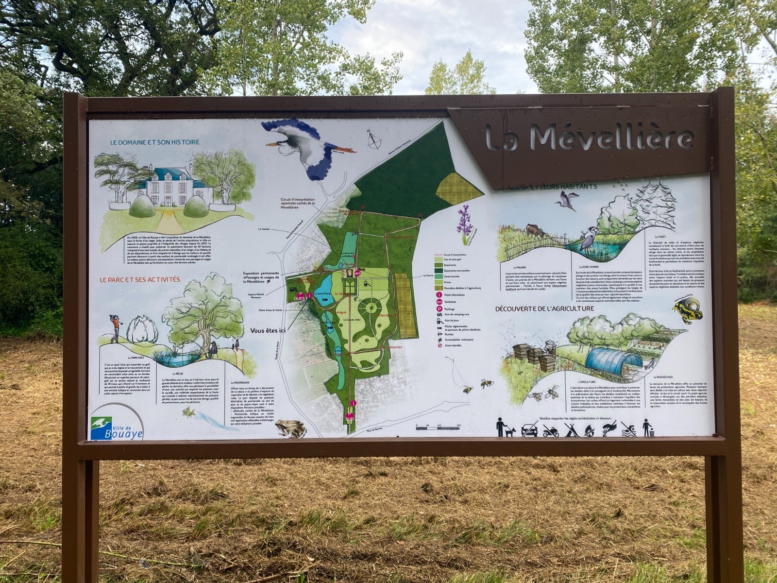 Il accueille une aire de jeux pour enfants, des sanitaires, des tables de pique-nique, des sentiers pédestres pour s’y promener ou pour y pratiquer le running, des prairies, un château datant du XVIII ème siècle et son jardin arboré, une charmille, un parcours de swin golf et de plans d’eau pour y pratiquer la pêche.