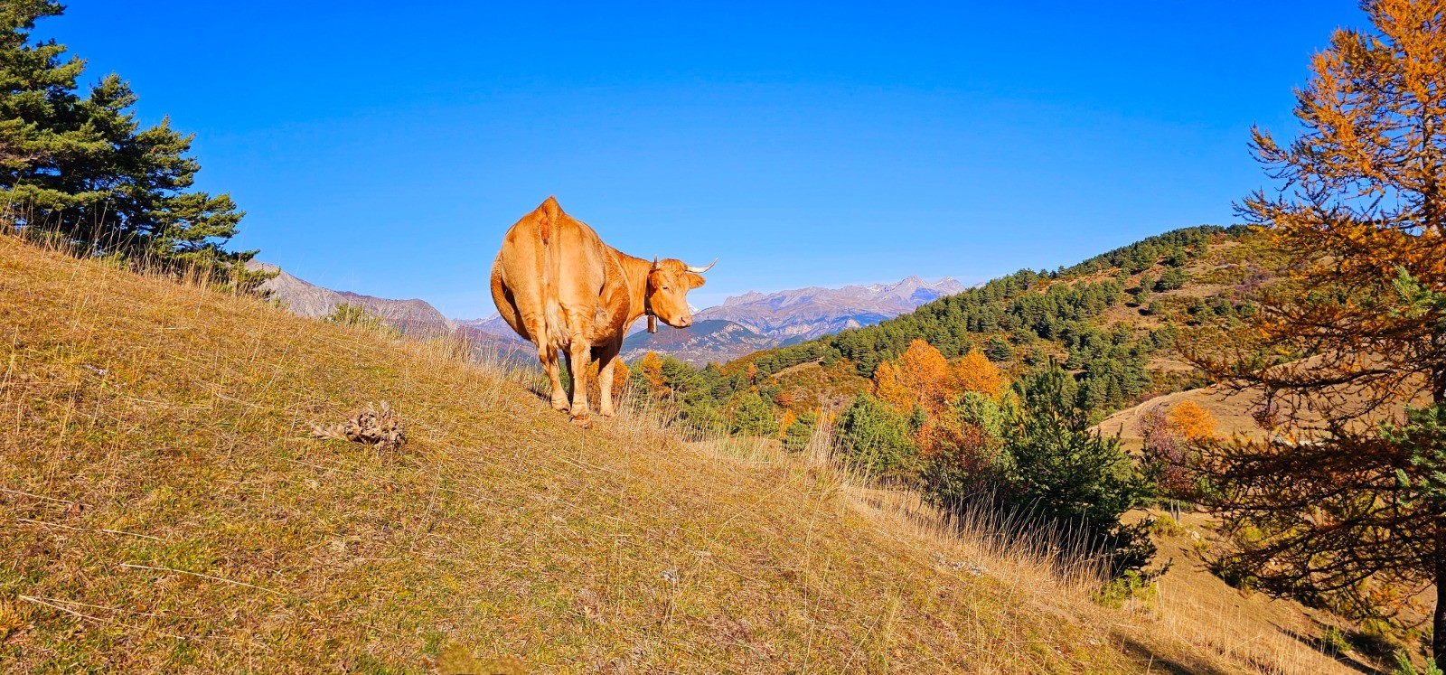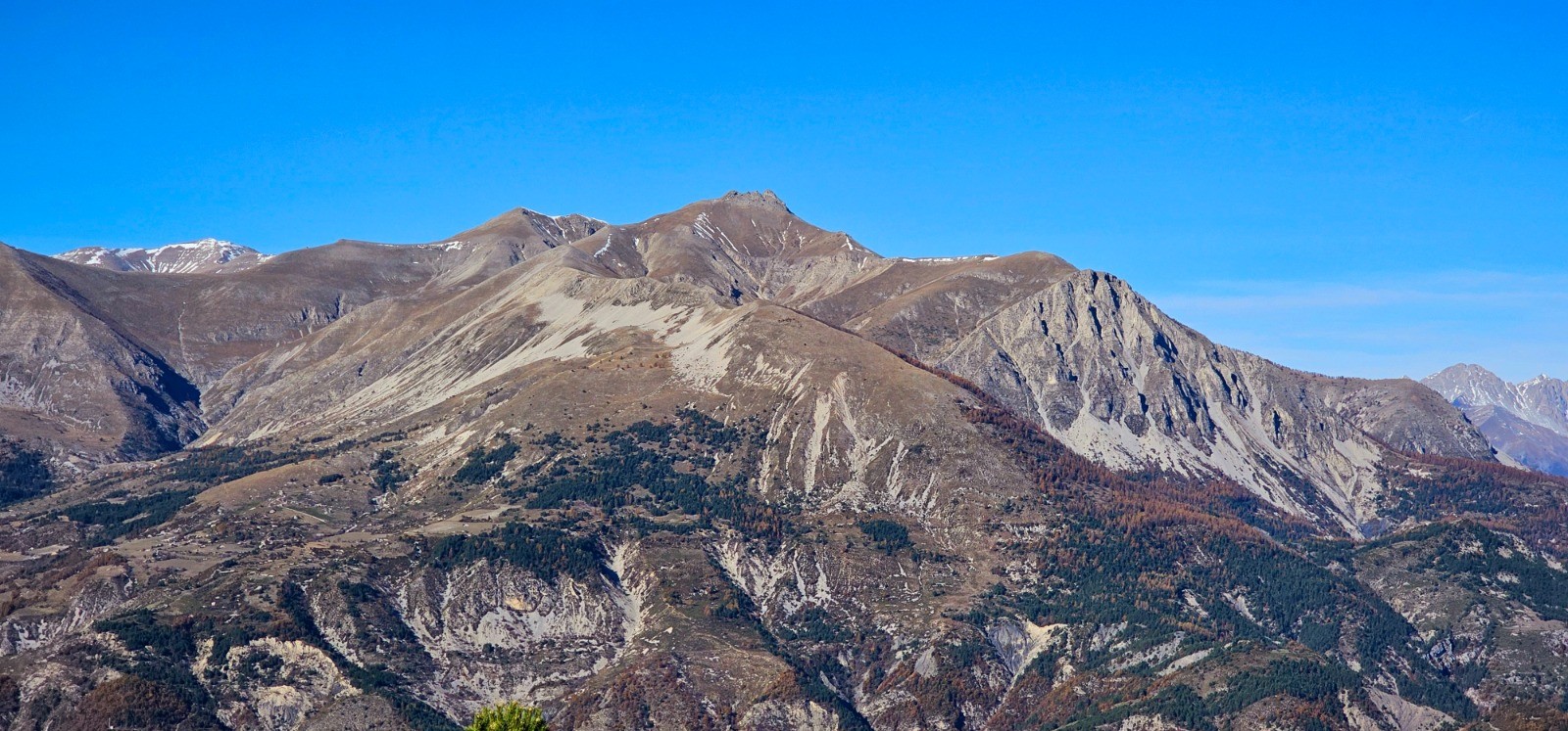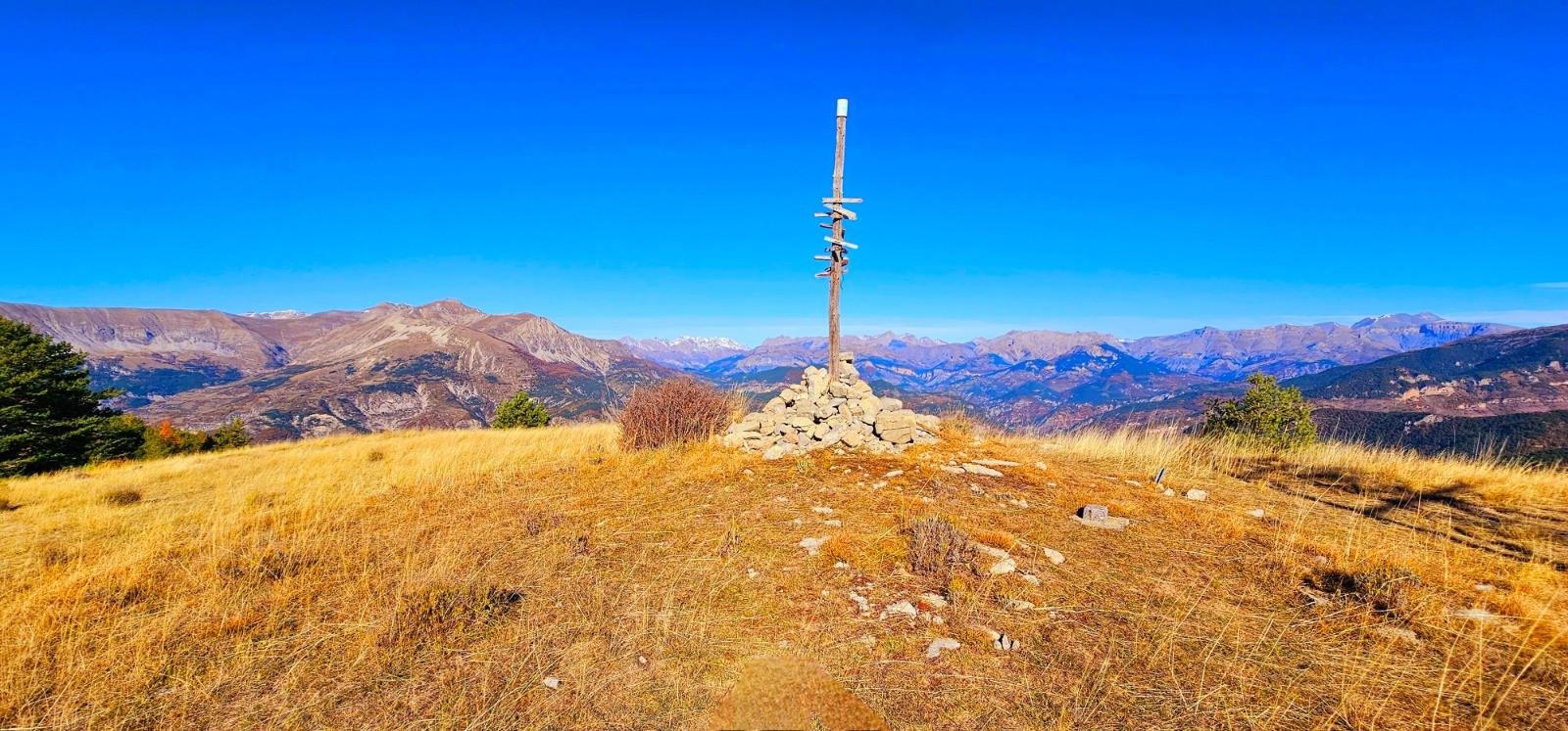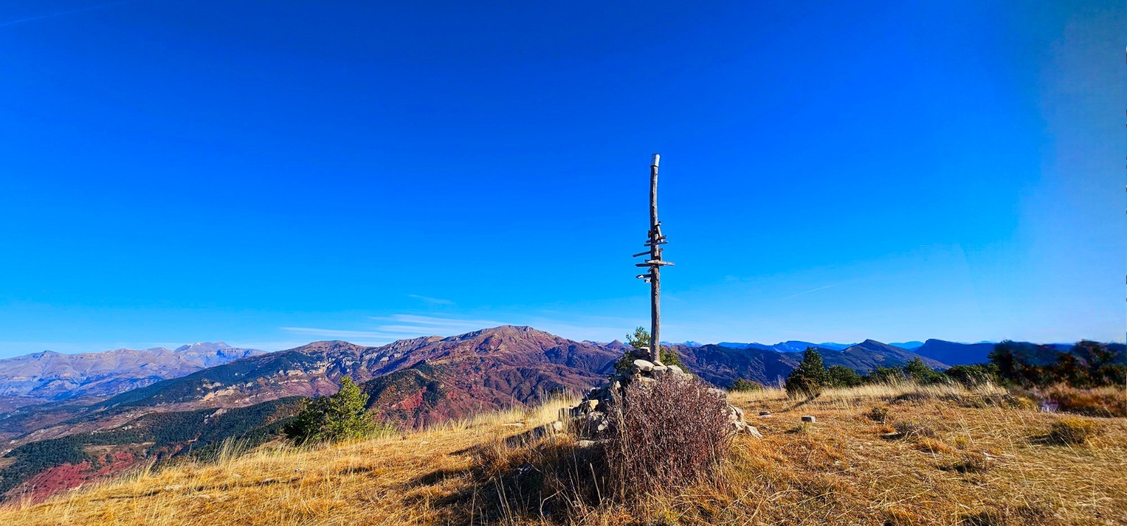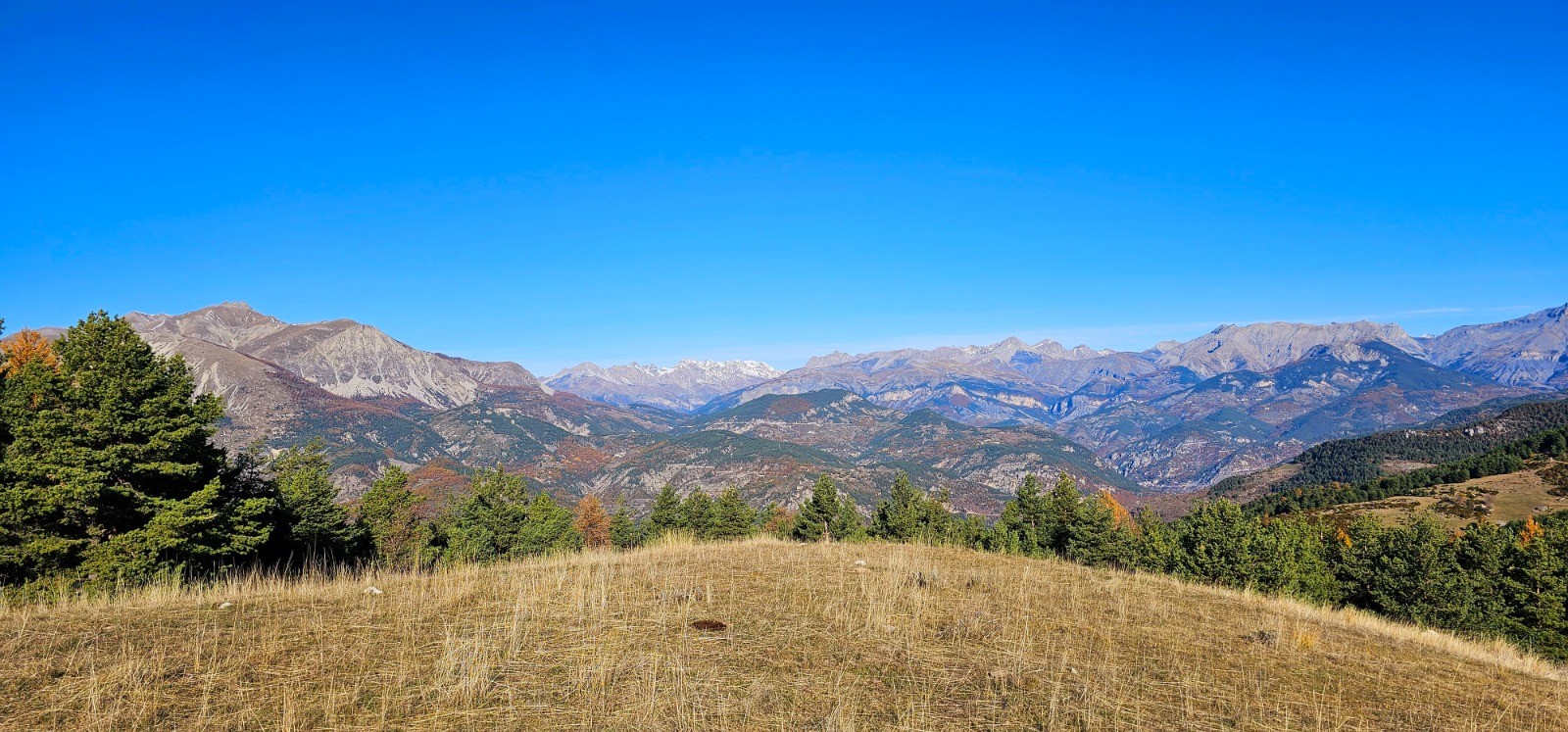 Précisons par ailleurs que la portion entre ce col et la Tête de Pibossan est la seule partie du circuit non balisée (2,10 km pour d+ 300 m) mais qu'elle ne présente pas de difficulté particulière. Il convient de localiser une sente qui serpente à travers bois jusqu'à la côte 1473 avant de remonter vers la Tête de Pibossan, en épousant l'arête élargie des courbes de niveau. Ces 2 sommets successifs se présentent sous forme de dômes émoussés à herbe rase et l'on visualise facilement le chemin à suivre avec l'antenne relais du Pibossan qui sert de repère. Panorama à perte de vue sur des reliefs moutonneux avec 2 sommets caractéristiques relativement proches, le dôme du Barrot et ses roches rouges au nord-est et le mont Saint-Honorat au nord-ouest.