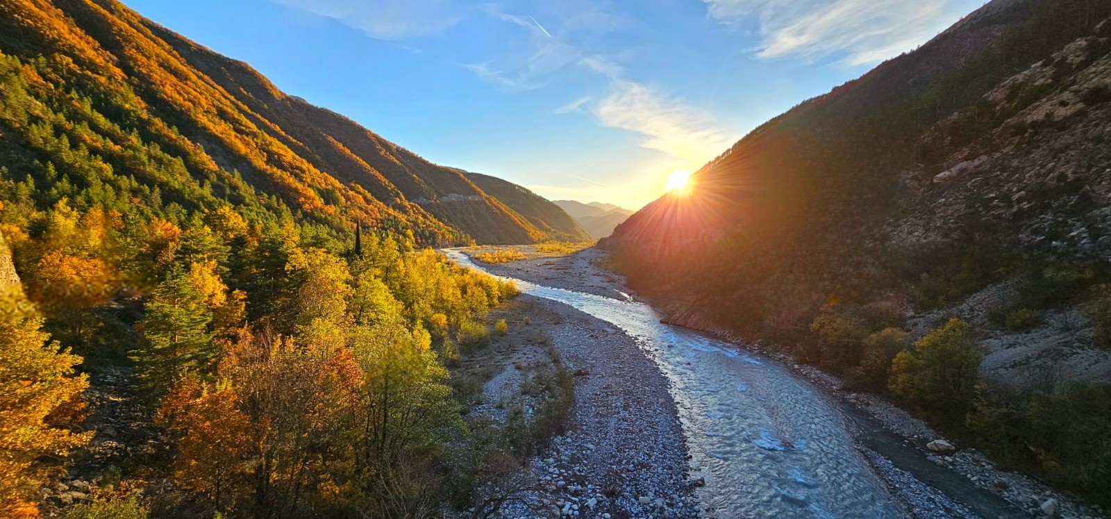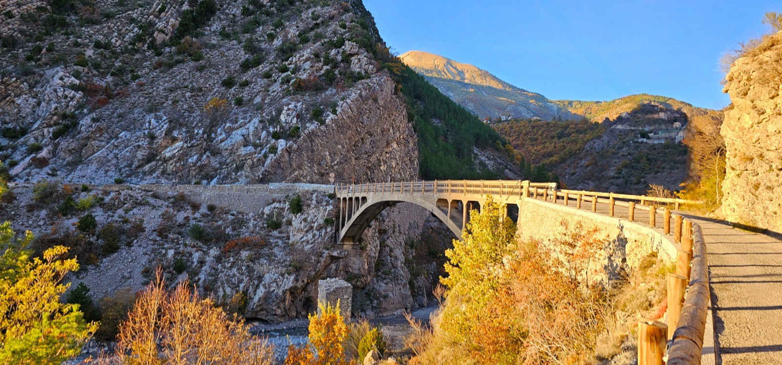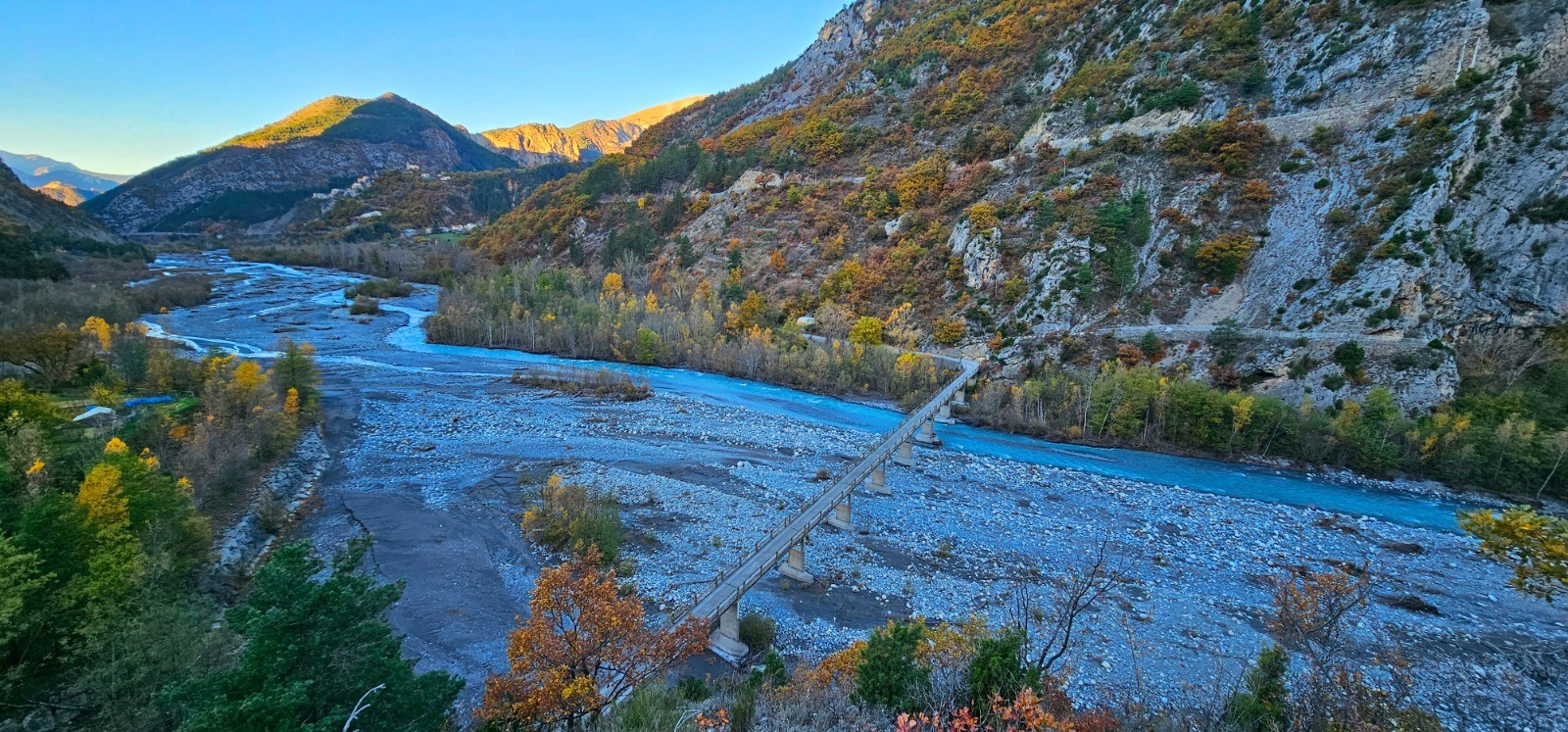 Ces 2 chemins se rejoignent à la balise 102 avec un superbe point de vue sur le vallon et le fleuve du Var en contrebas. Le chemin bifurque et descend plein nord par de multiples lacets sur la partie ombragée du bois de la Faye avant de parvenir aux balises 101 et 100 délimitant le pont à arche unique franchissant le Var et débouchant sur la D 2202. Retour au parking en suivant cet axe routier sur 1,68 km.