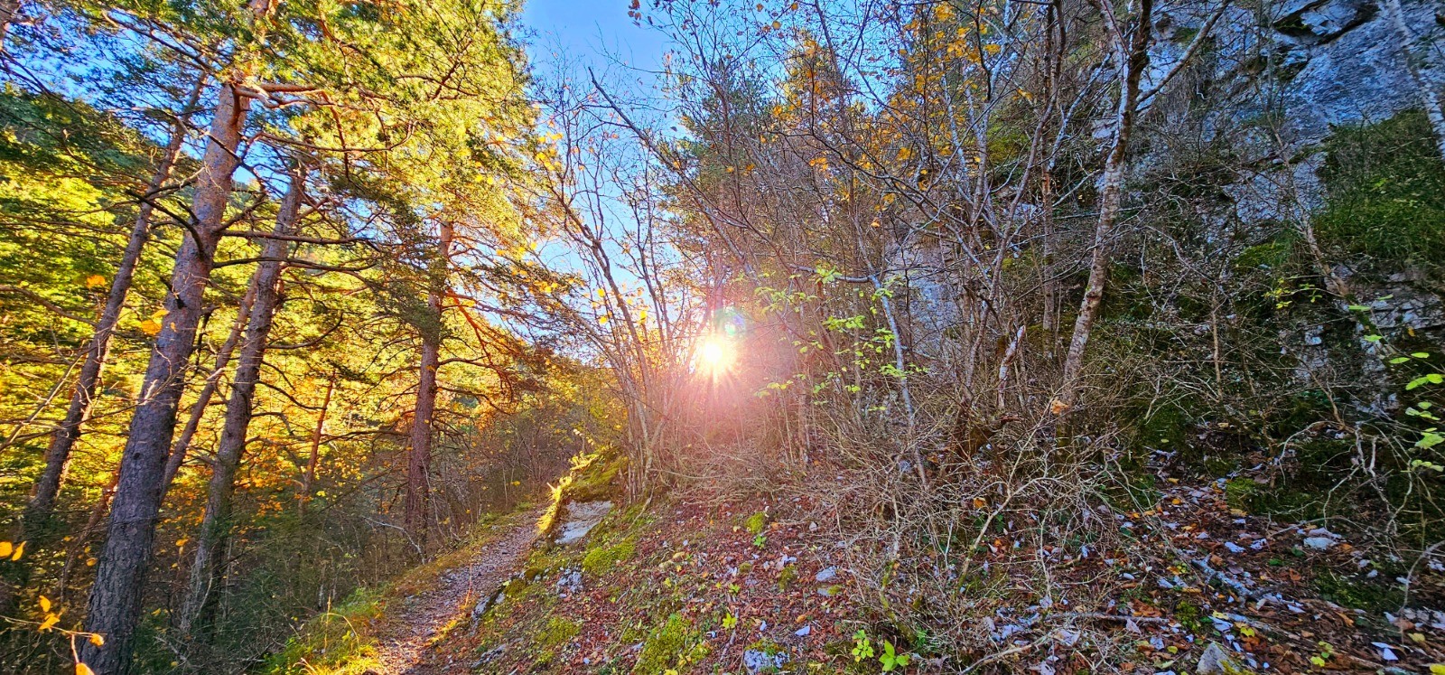 J'ai emprunté une belle piste depuis la balise 247 en traversant une magnifique forêt de chênes verts en deçà de la crête de la Faye mais il est possible de suivre cette crête par un chemin plus escarpé à partir de la balise 249 (église du village de St-Léger).