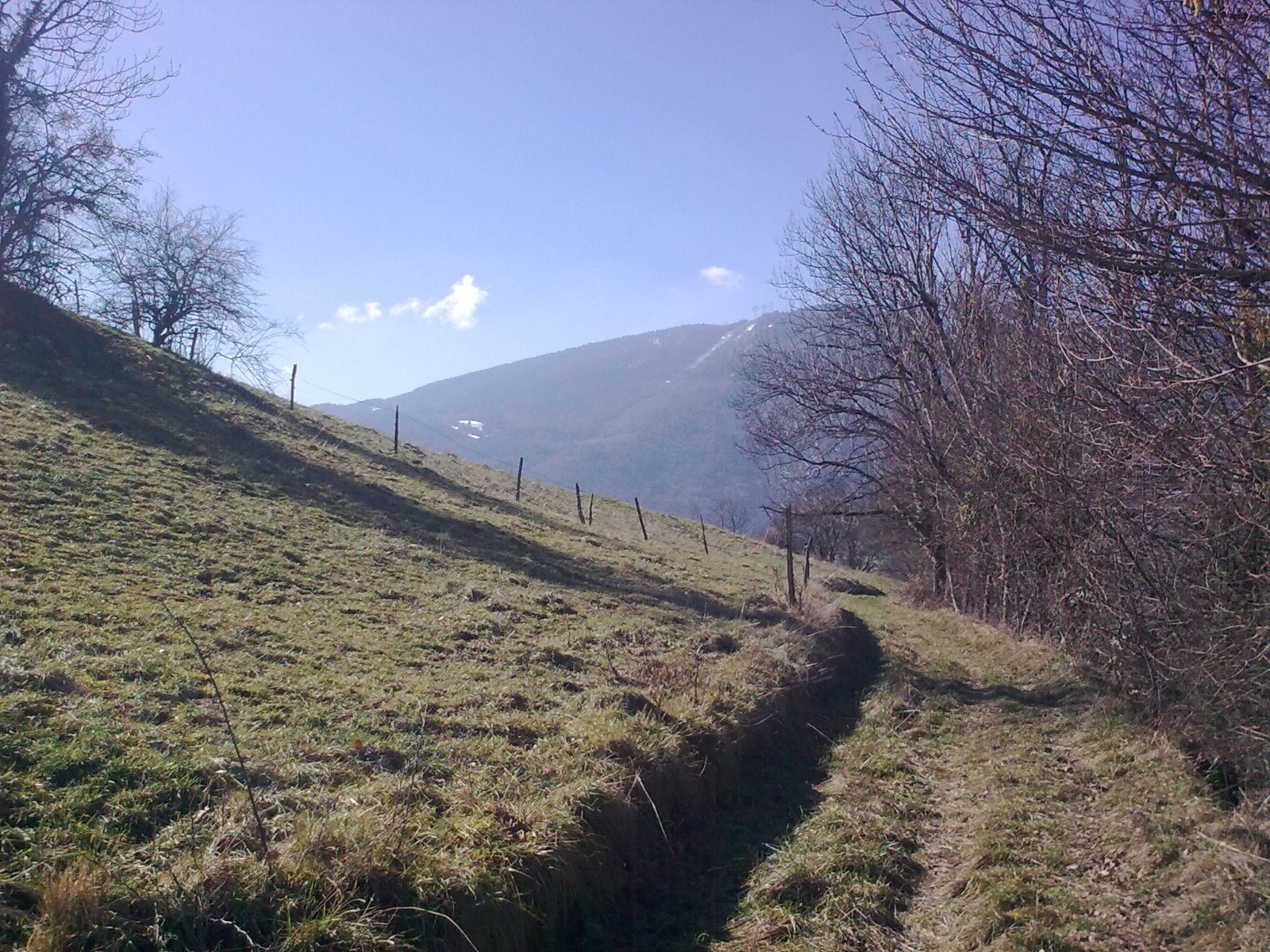Le remonter, puis après une traversée à plat évidente, remonter le pré jusqu'au sommet de la bute. (idem trace 2, ne pas y aller en période de fauche et quand il y a les vaches)