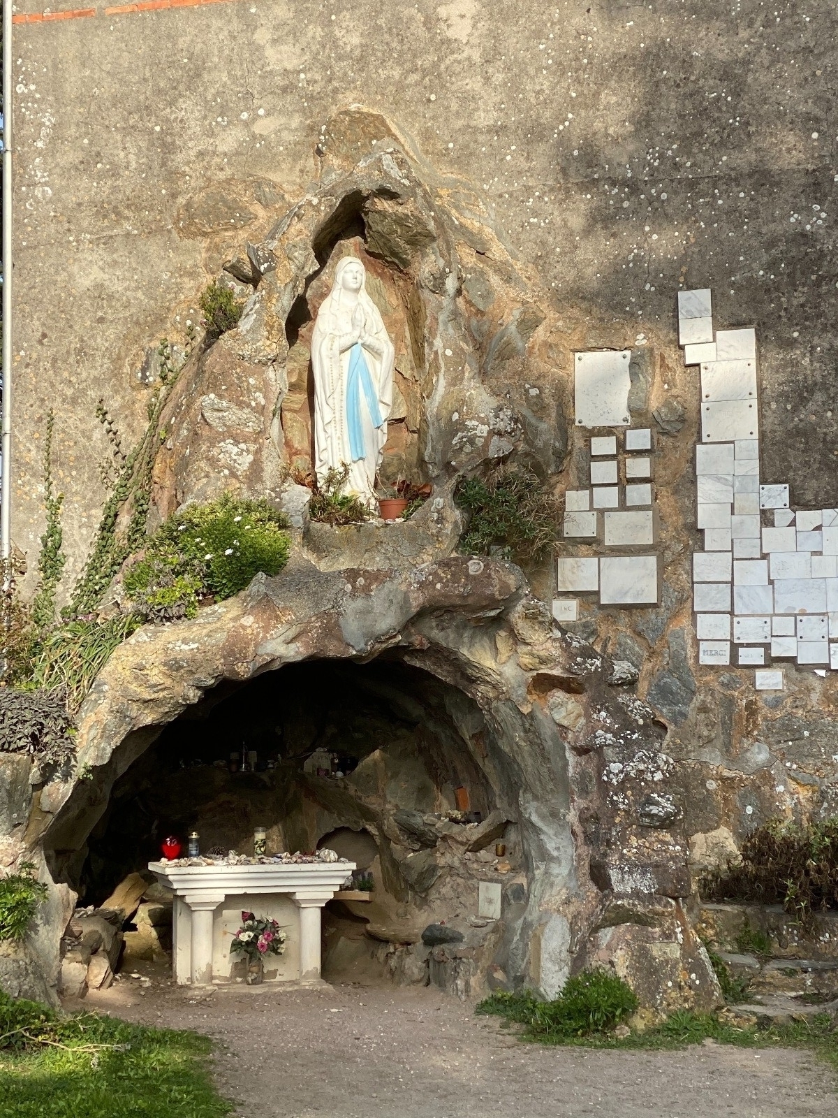A droite un petit square abrite la vierge dans une petite grotte artificielle ( photo no 2 ) couverte d'ex-voto.