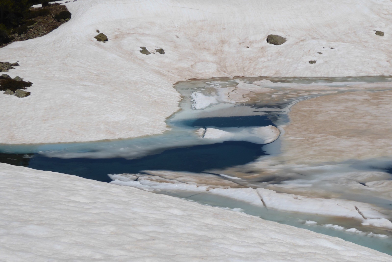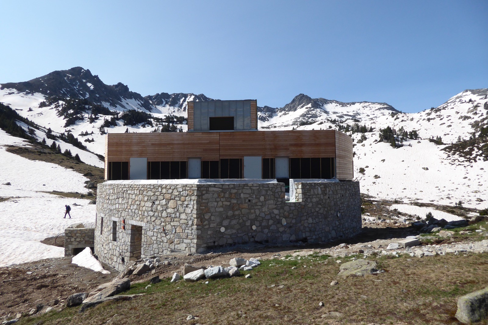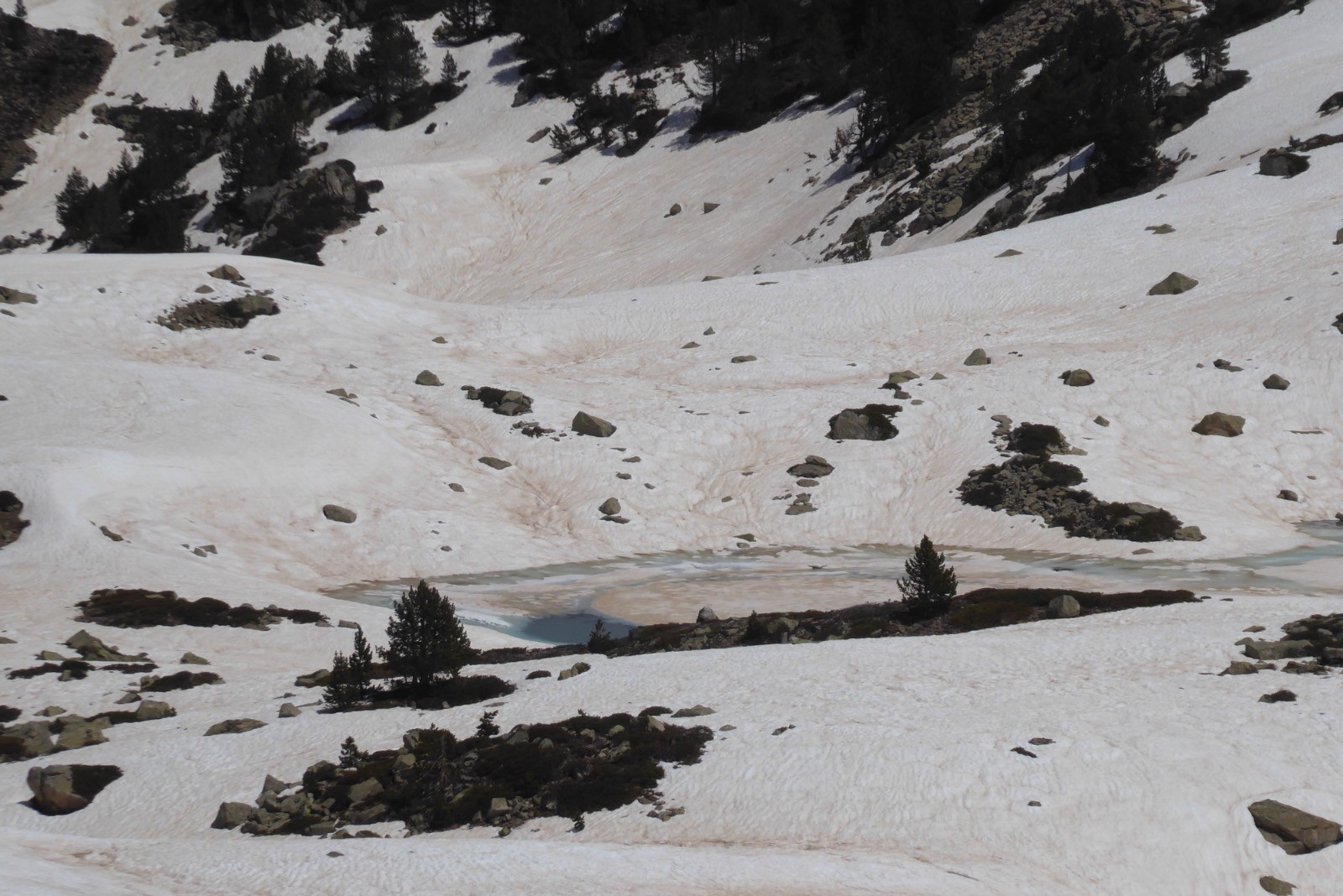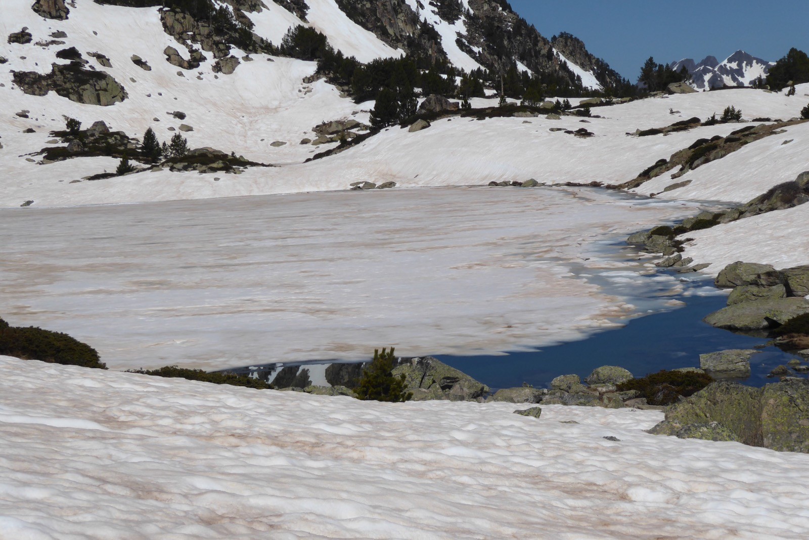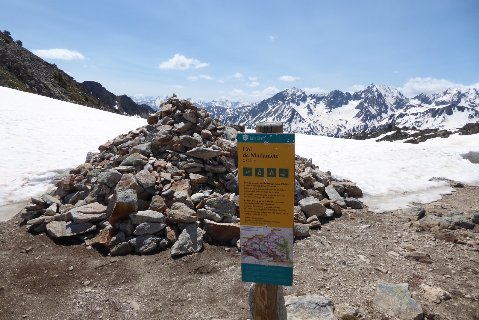 Une journée excellente pour aller voir l'avancée des travaux du refuge d'Aygues Cluses. Beaucoup de neige encore à cette date . Les crampons ont été utiles à partir des premières pentes vers 2300m et jusqu'au col de Madamète à 2508m. Du col, la vue est majestueuse sur les sommets avoisinants; Pic Méchant, Bugatetet, Campbielh, Pic d'Estaragne,Néouvielle, Ramougn, Pic Long, Pic du midi de Bigorre, Pic d'Espade . La route qui descend d'Aumar est dégagée, mais le Lac d'Aumar est encore pris par les glaces.
