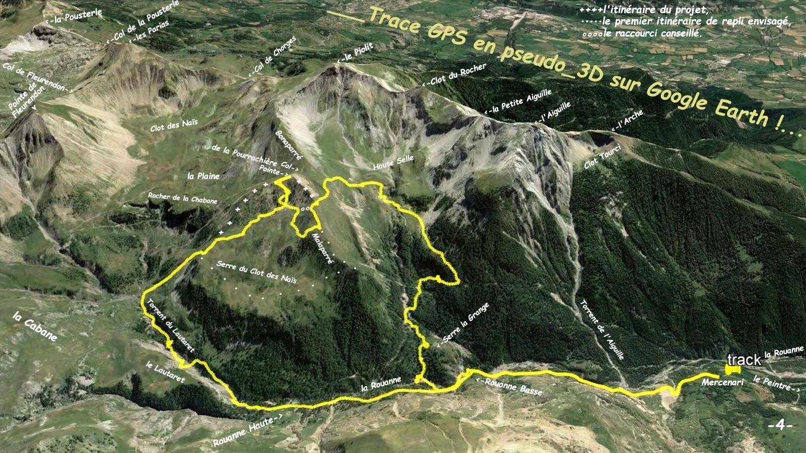 depuis Mercenari, 1460 m, Route de Rouanne Haute, jusqu'à la fantomatique passerelle au Nord-Est de