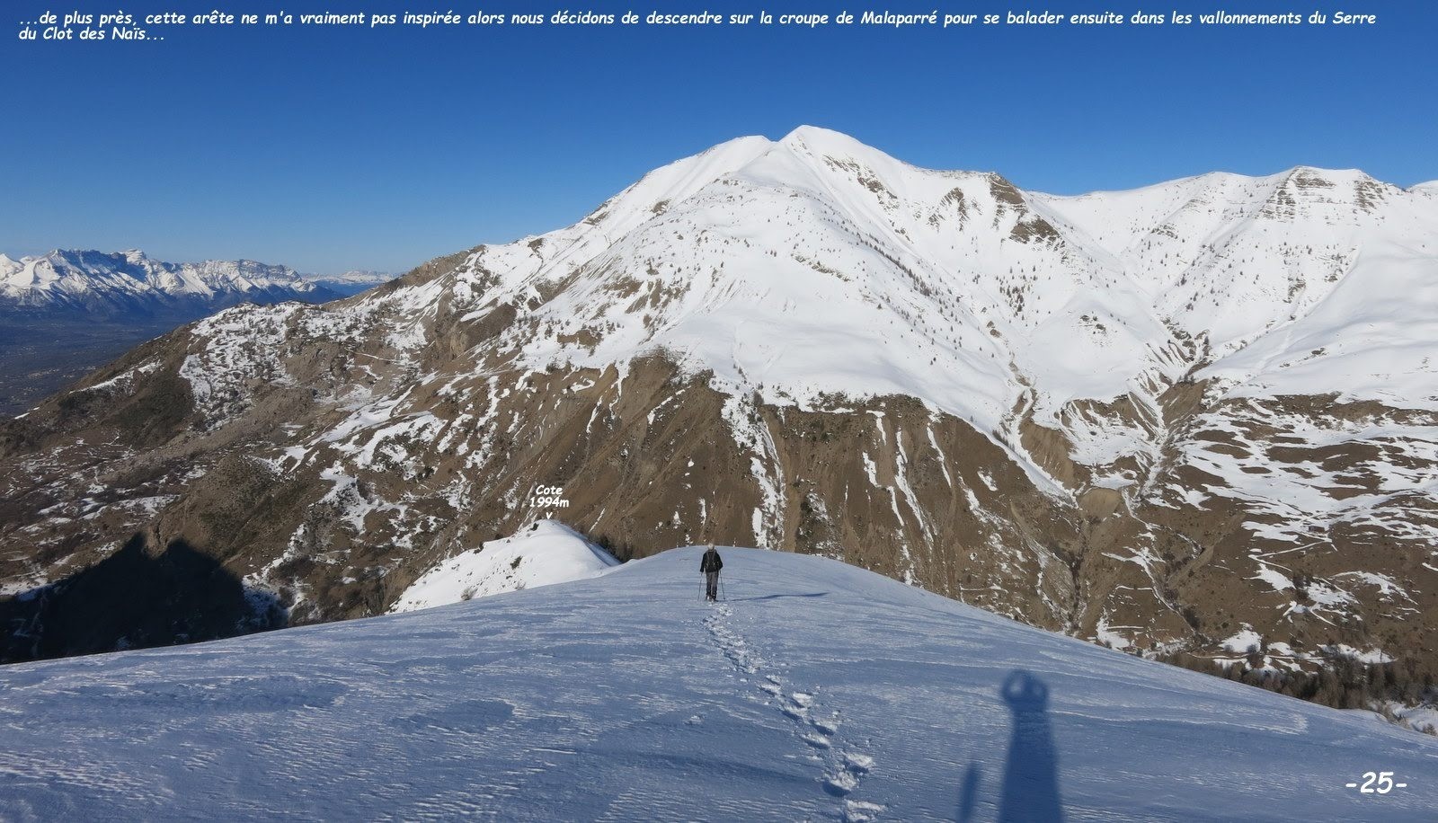 - si la fantaisie de son parcours d'arête vous tente mais qu'ensuite vous jugiez plus raisonnable d'emprunter notre trace, nul besoin de descendre vers Malaparré pour ensuite faire le dahu comme nous, si les conditions de neige le permettent, de son dôme couper directement jusqu'au-dessus de la cote 2072 m.
