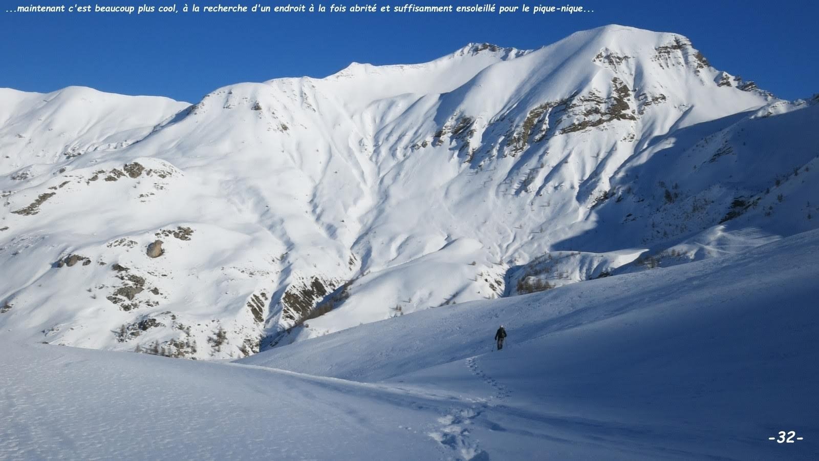 Cap Nord-Est pour retrouver dans l'ombre de la Pointe de la Pourrachière une neige bien plus accueillante au point de nous inciter à tenter son ascension directe par son versant Nord, en option de rattrapage. Ainsi nous avons pu atteindre son arête Nord-Est, à une cinquantaine de m du sommet, sur un petit collet à droite de sa protubérance rocheuse dont le franchissement, apparu comme quelque peu hasardeux, nous a privés de la descente par la suite de cette arête qui, immédiatement après, n'est plus qu'une crête apparemment sans souci (nous ne l'avons parcourue qu'une seule fois à la montée, hors neige !) ?! Alors, nous sommes descendus droit dans la pente : impressionnant mais facile et sans danger avec les conditions de neige en cours (danger maximal par neige dure ou en présence de plaques ! qu'on se le dise ! et raisons essentielles pour lesquelles nous privilégions autant qu'il se peut les parcours en crête et ne coupons les pentes que lorsque nous n'avons pas d'autre choix). Le retour par la piste pastorale en rive gauche du Torrent du Lautaret est un véritable régal, nous y retournerons, c'est sûr et à y être, pourquoi pas le Col de Chorges par le Nord, long, très long, mais quel dépaysement dans cet environnement enchanteur !!! Ce n'était donc qu'une randonnée de reconnaissance !...