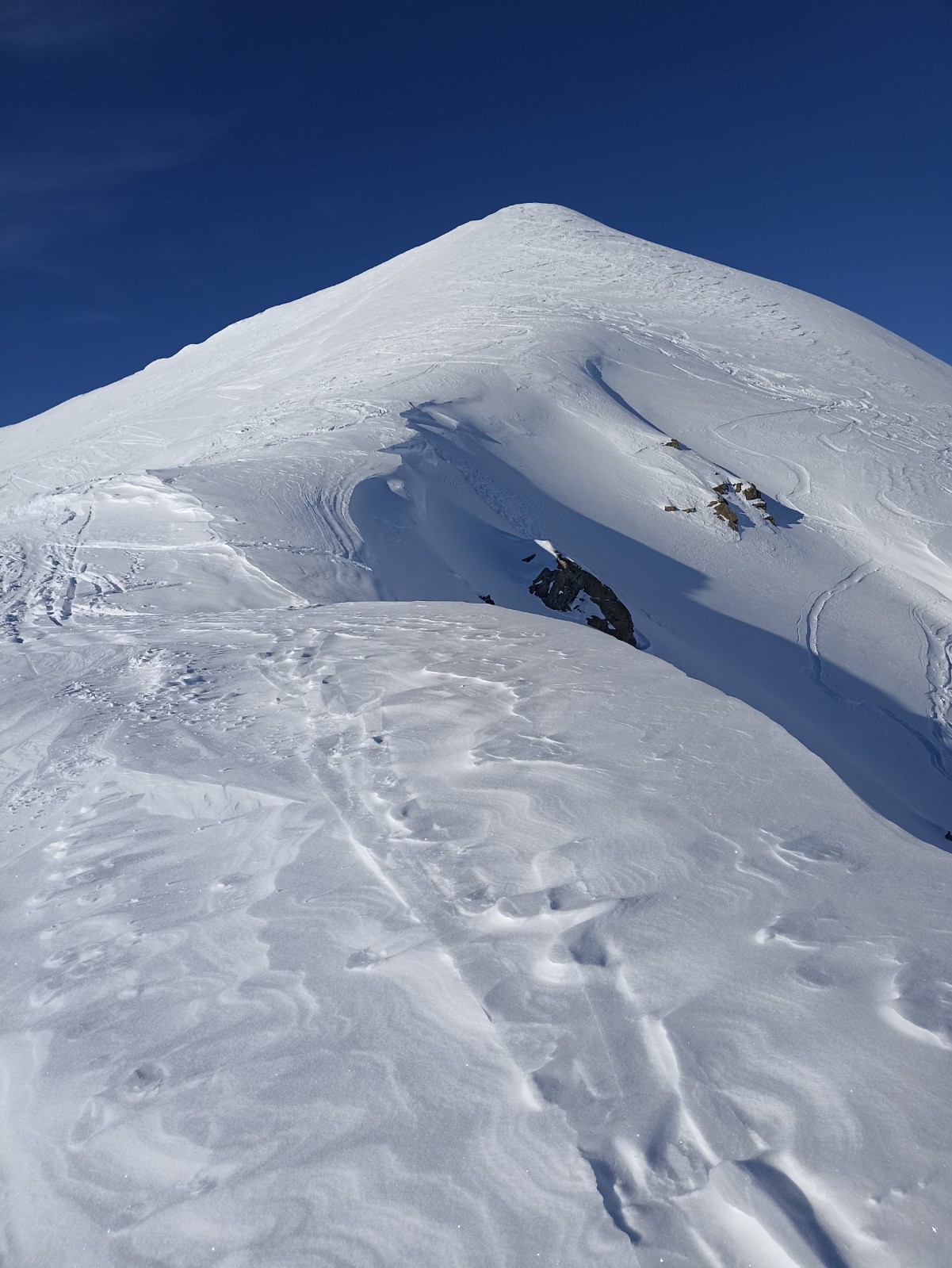 Bonne condition météo pour cette sortie. Neige souple entre 2400 et 2800m. Le sommet est rappé et les couteaux sont utile pour une plus grande sécurité.