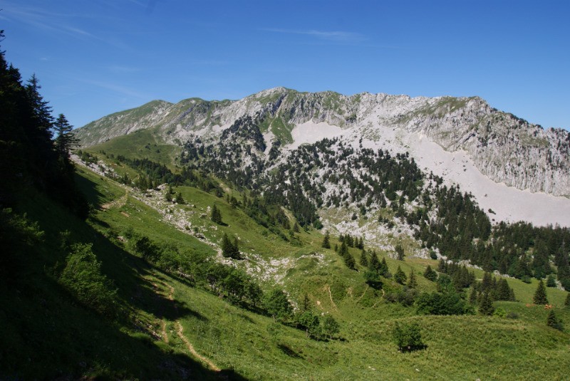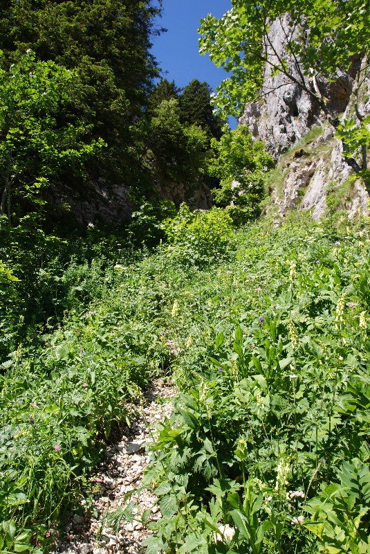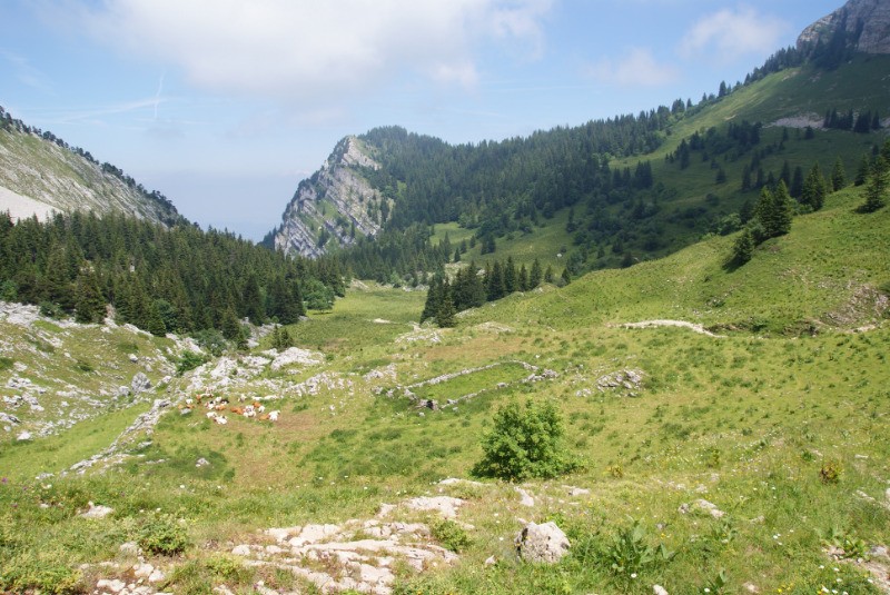 En période estivale la l'herbe haute peut rendre difficile à suivre le sentier entre le Pas de la Biche et le sentier du Col de la Petite Vache.