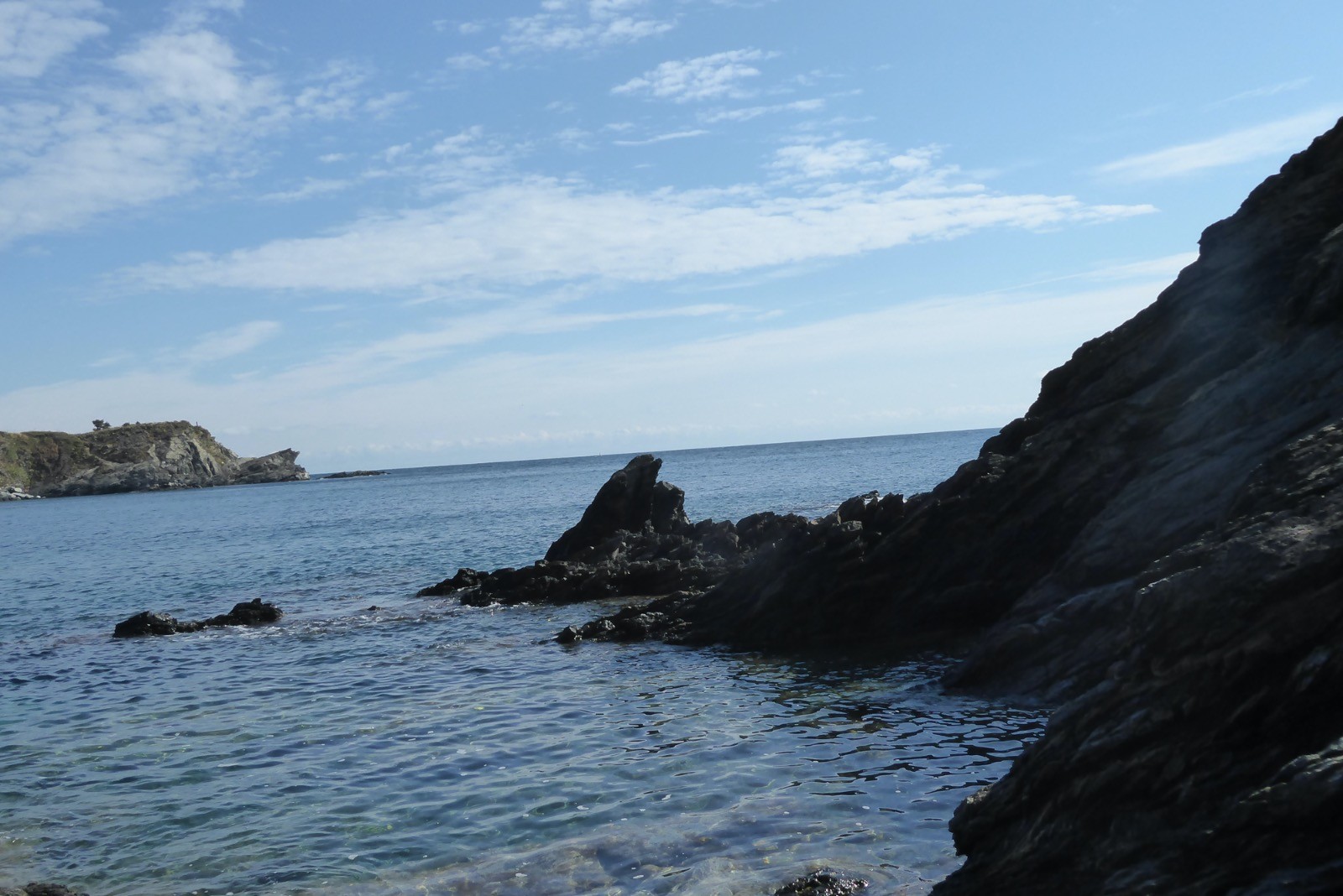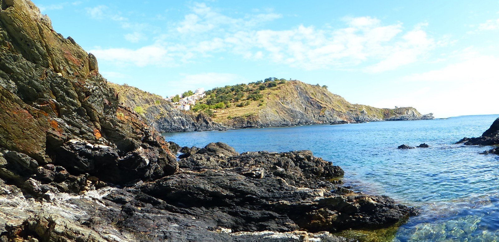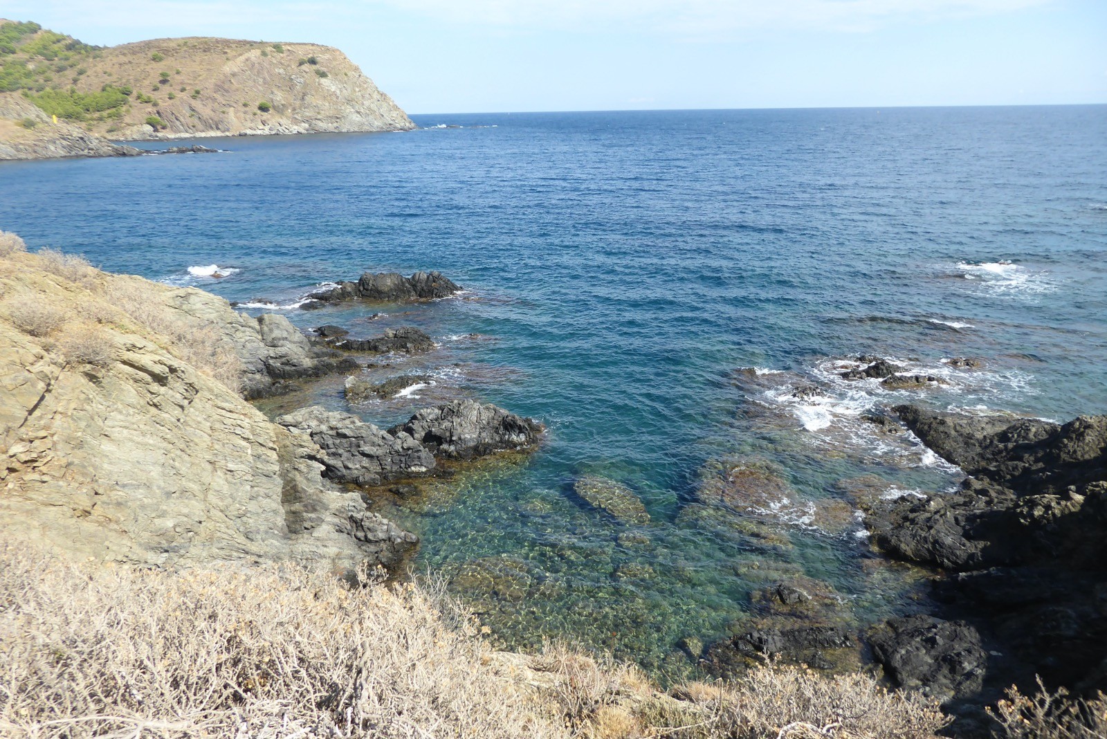 Premier jour de notre visite , nous allons suivre le sentier côtier de Cerbère à Banyuls....Dans la mythologie grecque, Cerbère est le chien polycéphale gardant l'entrée des Enfers. Cerbère dispose de la station balnéaire la plus au sud de la France. Sur le plan historique et culturel, la commune est dans le Roussillon, une ancienne province du royaume de France, qui a existé de 1659 jusqu'en 1790 et qui recouvrait les trois vigueries du Roussillon, du Conflent et de Cerdagne.Le sentier est superbe, nous faisant passer par de belles criques et plages, certes petites, mais magnifiques par la qualité de l'eau car c'est une réserve marine qui protège de belle espèces .C'est le première Réserve Naturelle Marine française créée en 1974. Elle s’étend sur 6,5 km et couvre 650 ha de mer entre Banyuls-sur-Mer et Cerbère (communes étant à l’initiative de sa création), juste au nord de la frontière espagnole.