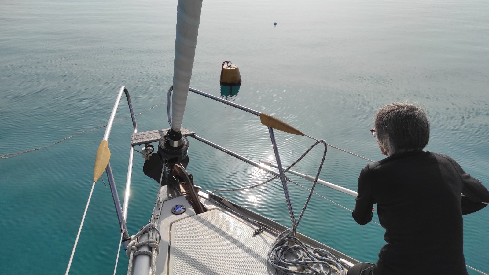 Il fait bien meilleur que pour la traversée pour la corse. Pas le moindre bateau à l'AIS ni en visibilité. La brume monte petit à petit. Nous laissons la lune disparaître, pourrions nous faire autrement, et Bernard vient prendre la relève. La sonnerie ne fonctionne pas comme prévue à cinq heure et le soleil émerge en même temps que nous. Heureusement Maryvonne est venue seconder Bernard. Le pont est humide mais et le soleil encore trop timide pour sécher le pont.