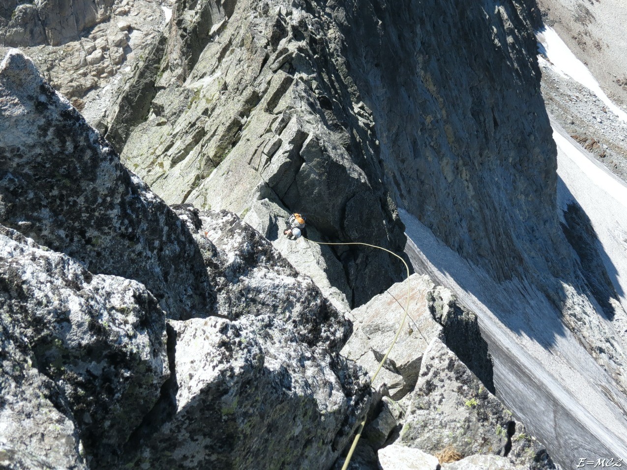 Descente par la voie normale au refuge. On a tiré un rappel au passage du « mauvais pas », pas obligatoire mais plus sécurisant avec la fatigue.