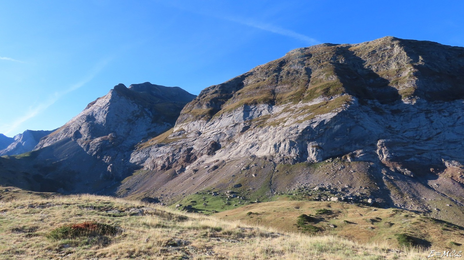 Départ vers la cabane de Groutte et le Maillet depuis le parking du barrage des Gloriettes. Le début de l’itinéraire est commun avec celui de la cabane d’Estaubé qu’il faudra laisser sur la droite à une quinzaine de minutes du départ. Passage par le Turon de Pouey Boucou. De ce sommet, ne pas descendre vers le plateau, rester sur la crête ou suivre le sentier du retour en léger contrebas (tracé GPS du retour). Il amène à la raillère qu’il faut traverser pour accéder à la vire qui rentre dans la grande gorge qui sépare la muraille en deux parties. La première partie de la vire est marquée par un balisage jaune qui s'arrête aux abords des grandes dalles calcaires. Continuer au-delà de la dernière marque en suivant la trace légèrement descendante sur une cinquantaine de mètres puis monter sur la gauche par quelques pas d’escalade facile sur une dizaine de mètres. Obliquer sur la droite vers la vaste dalle, repérer deux fractures parallèles et herbeuses, prendre celle du bas et traverser la dalle. Rejoindre le cône d’herbe, le remonter et tourner sur la gauche sur une vire herbeuse suivie d’une partie rocheuse équipée d’une main courante (câble). Après cette partie, le cheminement à suivre est plus évident, bien que peu emprunté, il se dirige vers le col 2606 m. Sans atteindre celui-ci, nous avons bifurqué sur la droite pour monter plus directement vers le sommet.<br>Retour par le même itinéraire.<br>*Nous avons perdu beaucoup de temps à chercher la suite du balisage et la suite de l’itinéraire, qui, une fois trouvé semble évident.