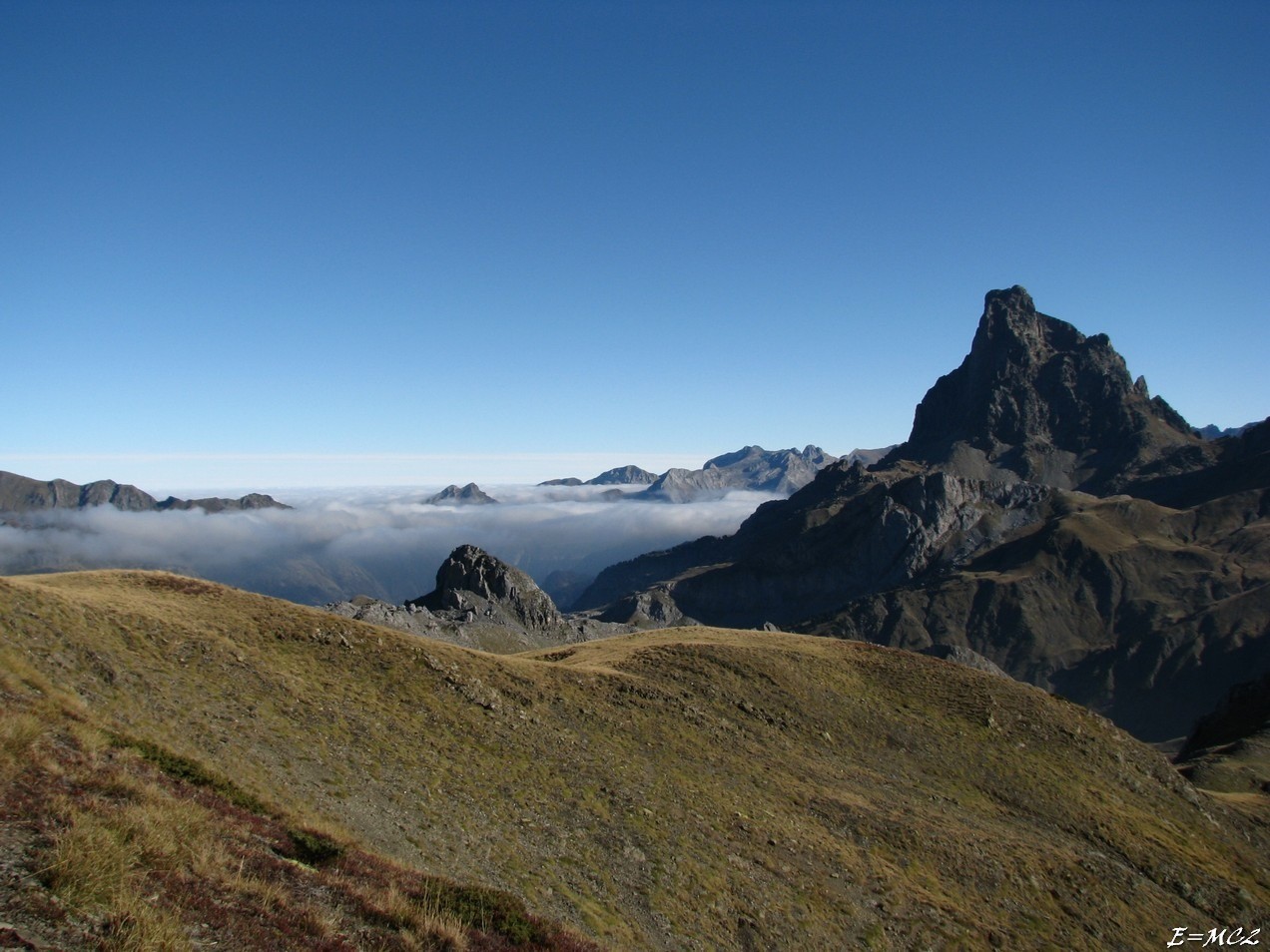 Du sommet descendre vers le nord au Col de Bielle. De ce col, on peut faire un aller et retour au Pic de Bielle. Pour cela, éviter le ressaut raide en faisant une traversée ascendante sur la droite et revenir sur la crête dès que possible pour finir de monter au Pic de Bielle. Du Col de Bielle, descendre à l’est, croiser le sentier reliant le refuge d’Ayous au Col des moines pour descendre vers le Lac Castérau. Continuer sur ce cheminement jusqu’à retrouver l’itinéraire de la monter pour finir de revenir au point de départ.