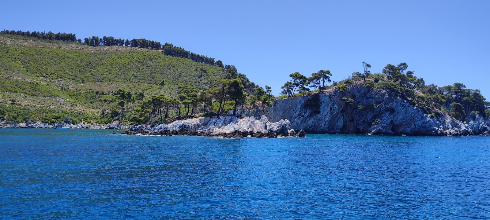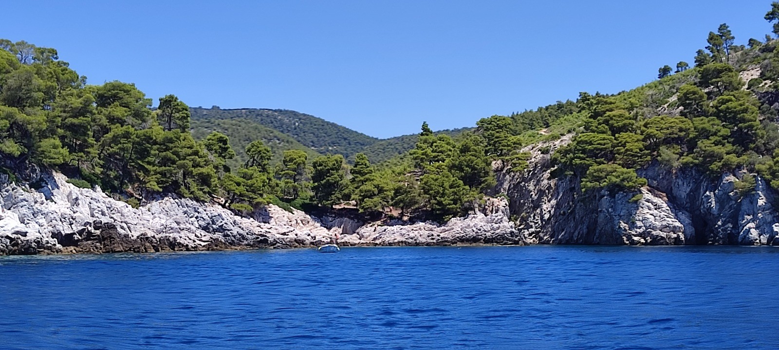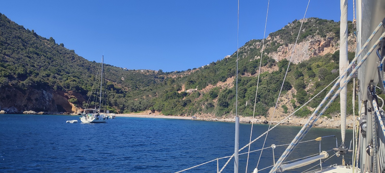Nos voisins nous disent au revoir déçu que l'on ne reste pas semble+t-il. Nous partons à la voile après avoir enlever les aussières en paddle. Départ vent arrière à la voile mais très vite moteur. Nous passons quelques beaux rochers. Arrêt pique nique en face d'une plage. Nous venons de repartir pour Alonnisos avec plus de vent. De beaux bords au près, en course avec un autre voilier (enfin lui ne le sais pas). Nous venons de le doubler.