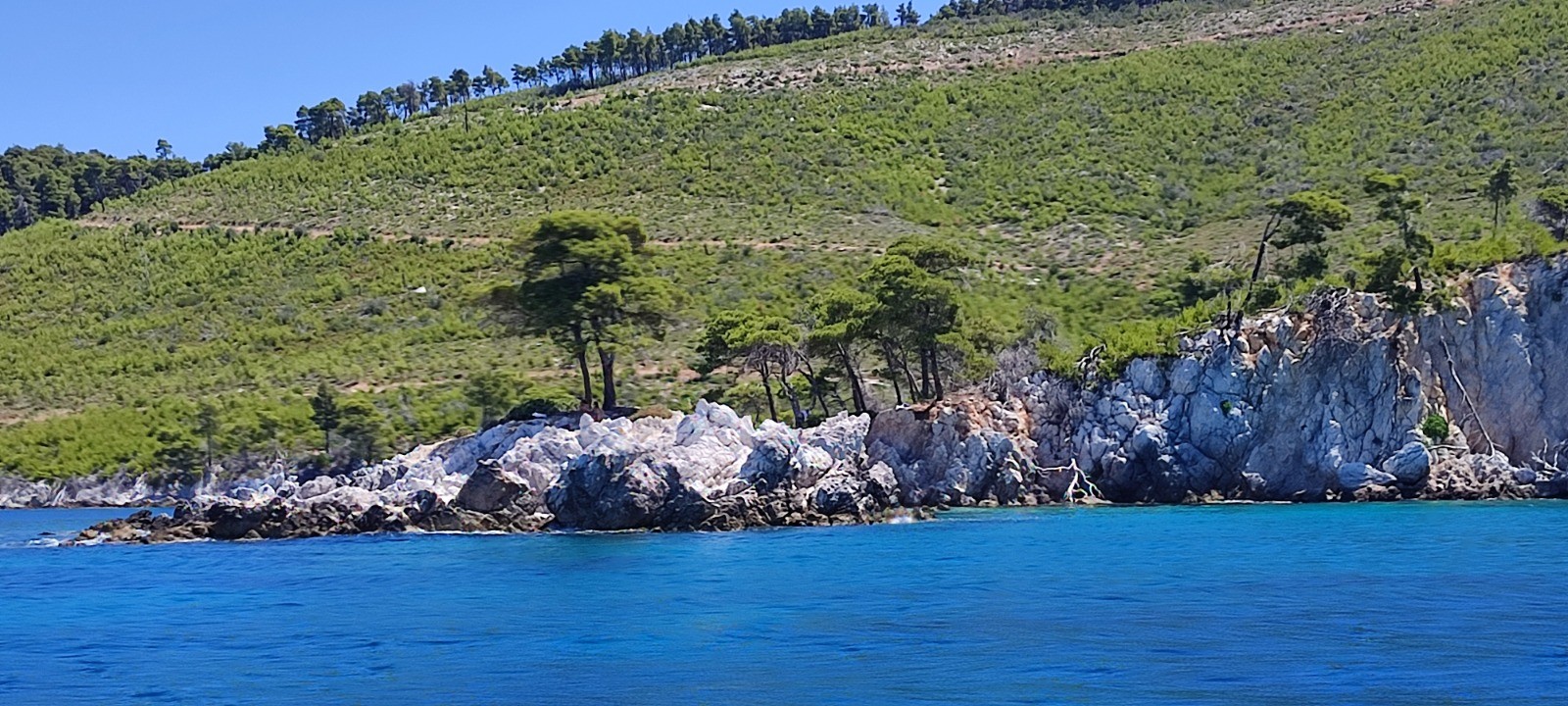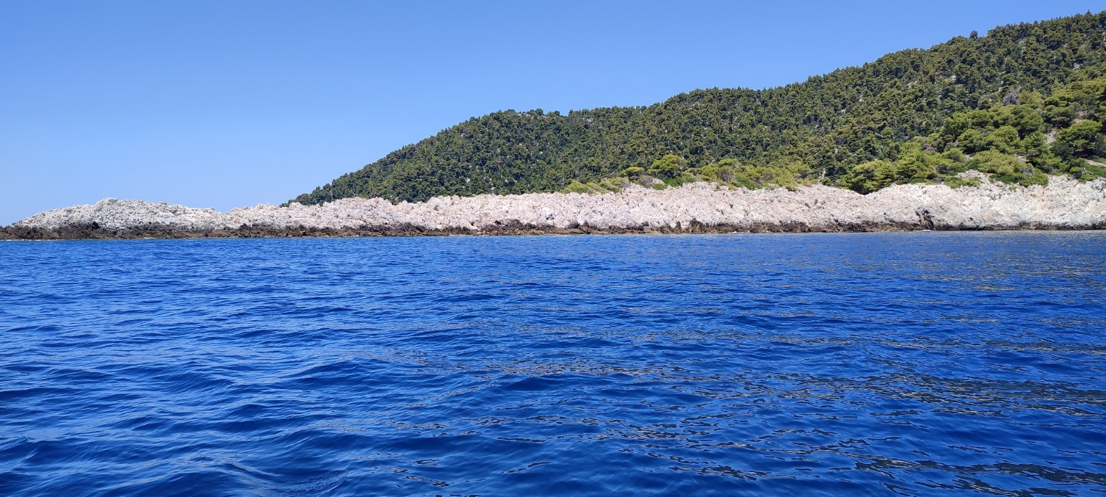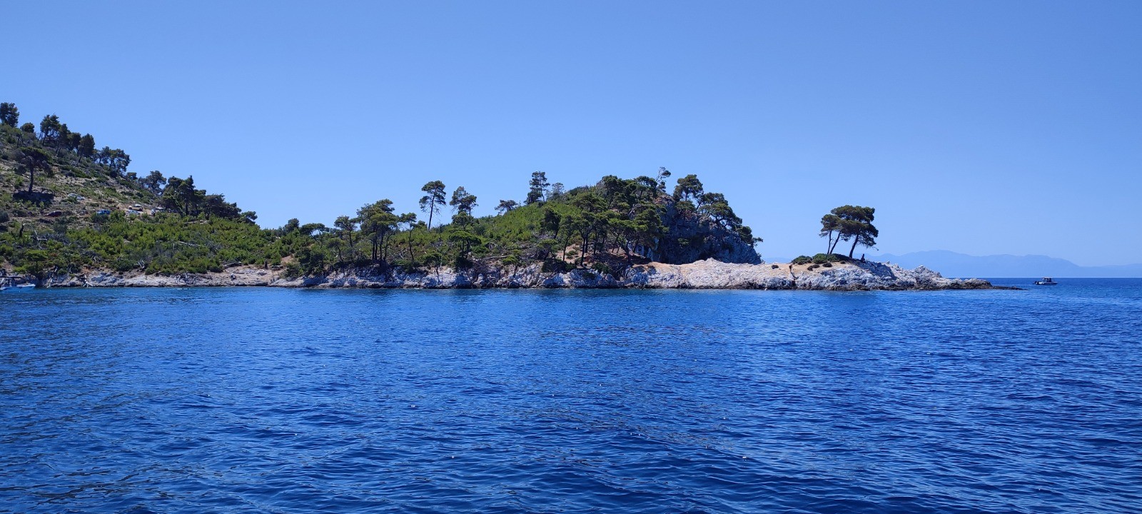 Nos voisins nous disent au revoir déçu que l'on ne reste pas semble+t-il. Nous partons à la voile après avoir enlever les aussières en paddle. Départ vent arrière à la voile mais très vite moteur. Nous passons quelques beaux rochers. Arrêt pique nique en face d'une plage. Nous venons de repartir pour Alonnisos avec plus de vent. De beaux bords au près, en course avec un autre voilier (enfin lui ne le sais pas). Nous venons de le doubler.