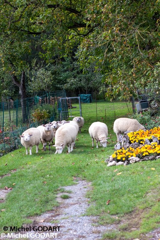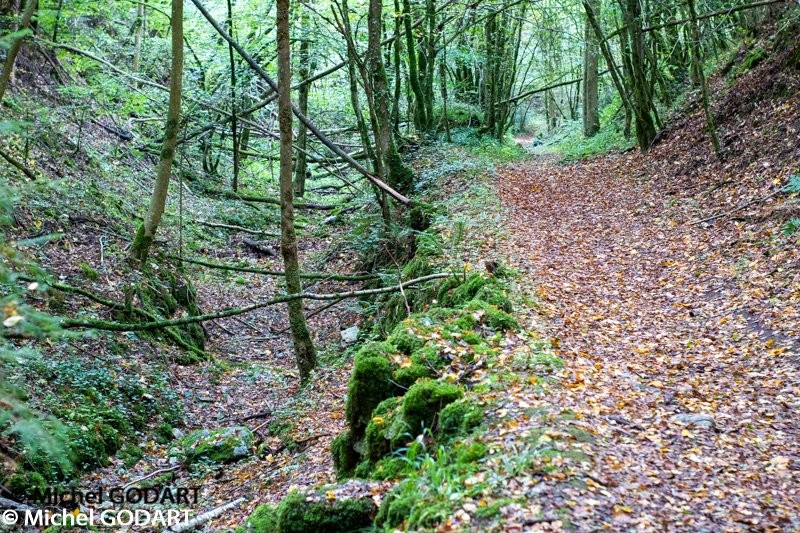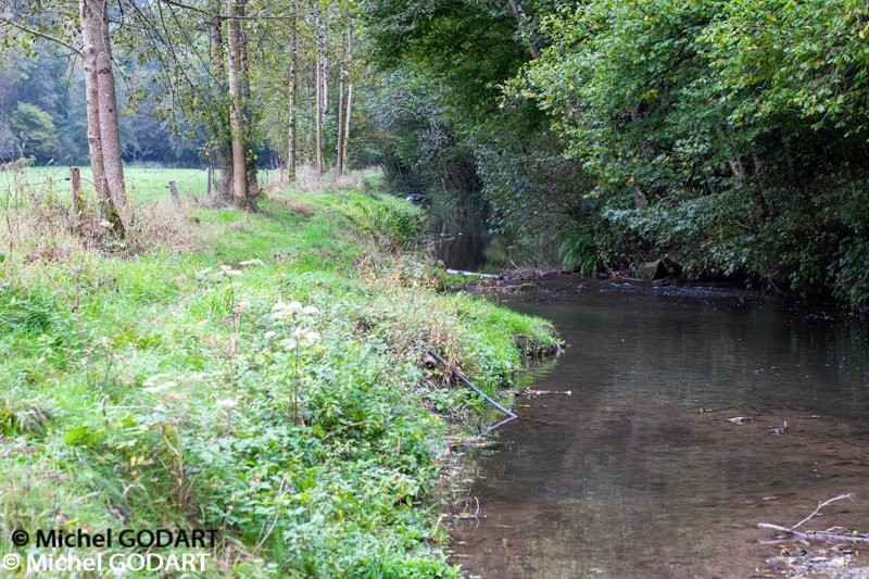 1) Au km 6.3, après la vue sur les ruines de Montaigle, vous passez un «tourniquet». Prendre directement à gauche une barrière (faite pour) et traverser la prairie qui longe une petite rivière (le Flavion). Au bout de la prairie, une seconde barrière est à franchir.