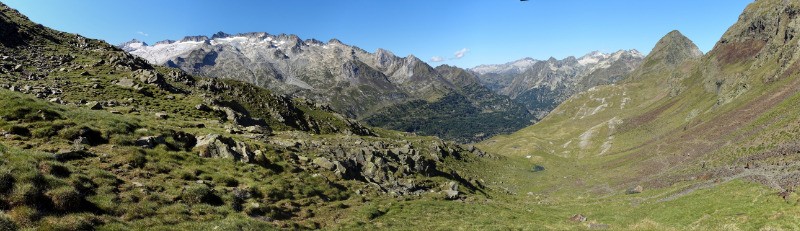 Hospice de France. Montée au Port de Vénasque par le refuge éponyme et les lacs de boum. Descente versant Maladetta pour rejoindre le Port de la Picade et le Pas de l'Escalette, avant de revenir, par la crête des crabides puis le sentier de Fontaine rouge au point de départ.