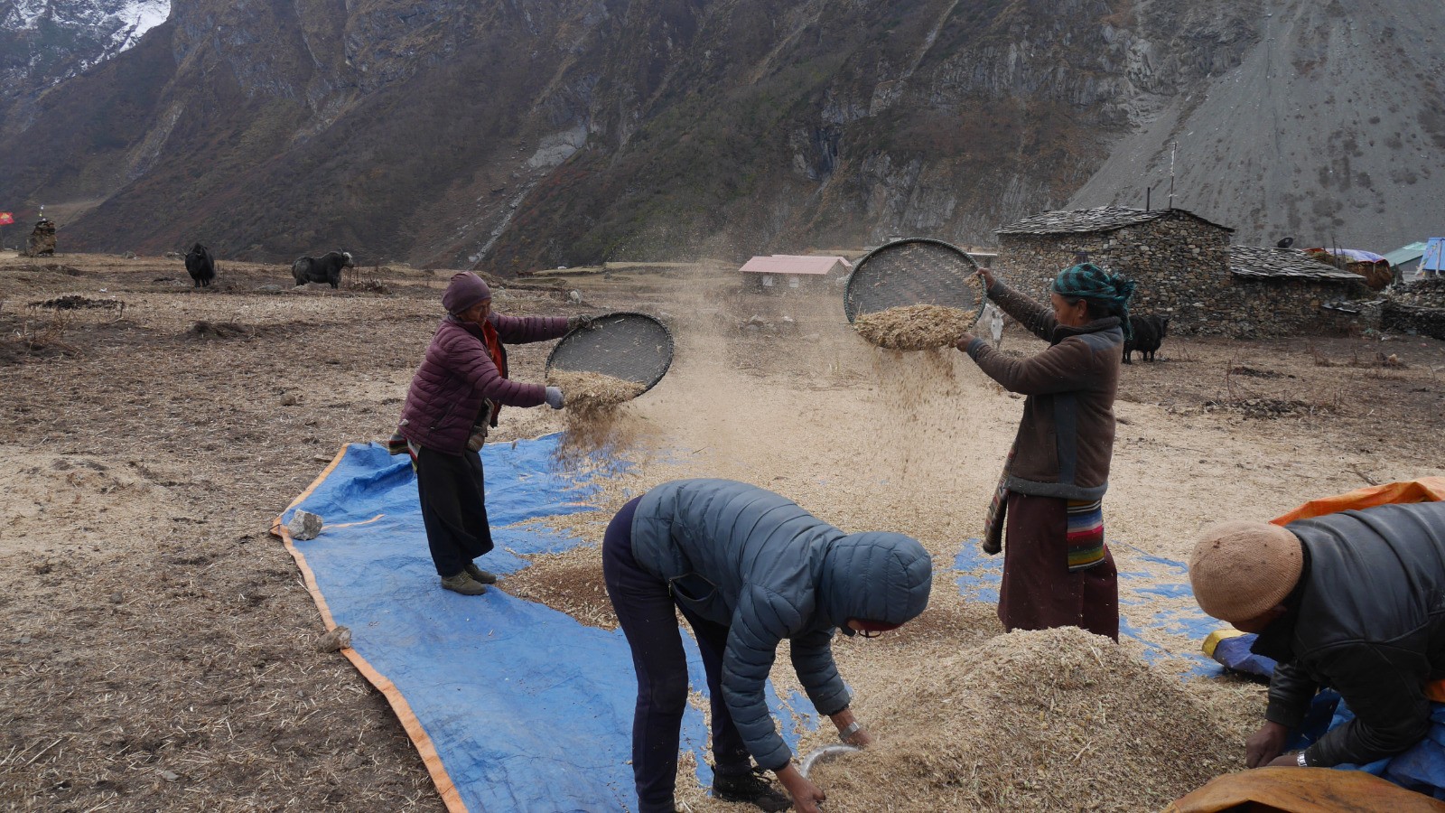 Visite du village qui est de loin le plus prenant. Samdo est à 3800m d'altitude, mais les conditions de vie sont des plus sommaires. Les maisons et ruelles sont dignes du moyen âge. Je part pour une ballade, les filles vont rendre visite au maire et pilier de l'ONG "Samdo Avenir" qui ?uvre au développement du village. Je remonte une moraine au milieu d'un troupeau de Yaks, Naks et autres Dzo, jusqu'à 4085 m. Les paysages de la plaine sont splendides. Au retour, je m?arrête pour voir la séparation du grain de la paille avec le vent.