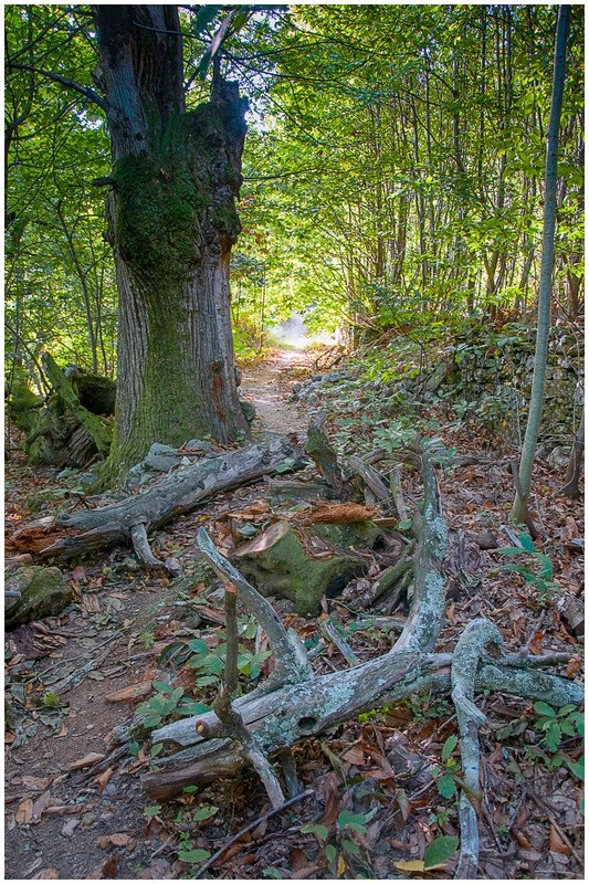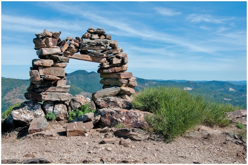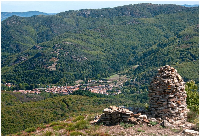 Franchir le portail, ignorer le sentier qui part sur la gauche flanc nord et prendre la sente se situant au- dessus vers la crête de la Serre de More . le sentier grimpe et contourne un peu plus haut l'Arête rocheuse par le coté Nord. Après les rochers, la pente s'infléchit pour atteindre le point culminant à 803m. (pause pique nique).(vue au Nord sur les falaises d'Orque et le pilier d'Albès, le Mont Marcou, les monts d'Orb et au loin la Seranne, le Liausson, le Vissou , la mer de Sète à Agde, les avants monts et le pic de la Coquillade et plus près, caché au sud par la ligne de crête la plus proche, le Caroux). Redescendre dans la lande et juste avant d'atteindre une ruine et les châtaigniers, à la cote 570m, prendre à droite le PR qui revient un peu en arrière (panneau partiellement caché par un petit châtaignier). On monte très légèrement en palier vers l'Ouest avant de descendre et plonger , d'abord à travers une zone rocheuse, puis entre deux beaux murs en pierre sèche vers le ruisseau de Casselouvre que l'on traverse. On remonte sur l'autre versant et après un petit col, on attaque la descente vers les hameaux de Court le haut, puis Court le bas puis Compeyre. On passe ensuite près du cimetière et de la chapelle Saint Barthélémy avant d'entrer dans Saint Gervais sur Mare. Place de l'Église, aller à gauche, franchir à nouveau le Casselouvre et rejoindre à gauche le parking.