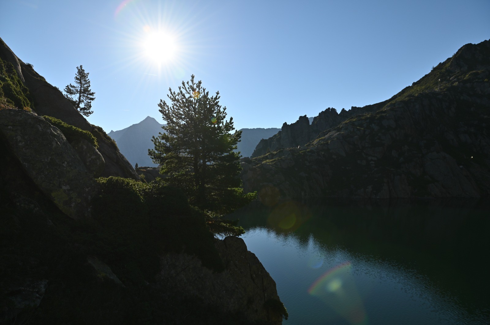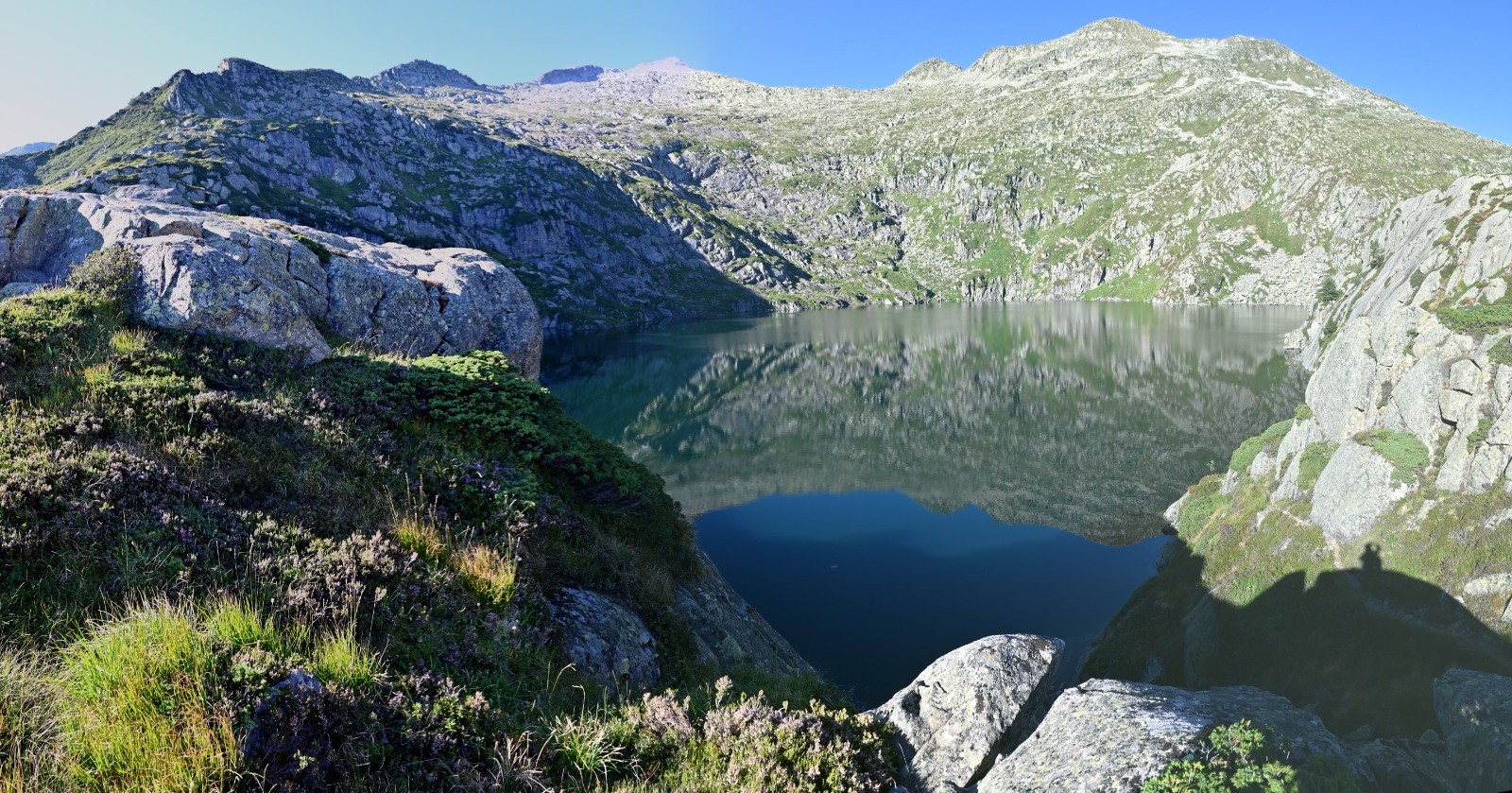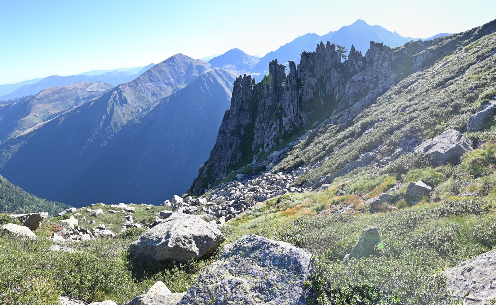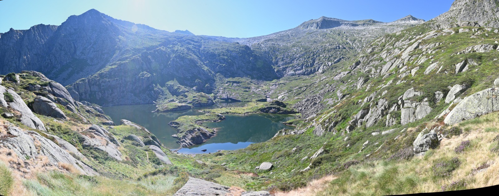 Au niveau de l'étang ( à peu près inaccessible car il est ceint de parois raides ), pour continuer l'itinéraire, il faut rester au bas du déversoir ( on ne voit pas l'étang de là ) et suivre le sentier Nord-est. Une montée permet de franchir la première arête sur sa partie haute, puis une descente à travers des éboulis ( fatigante - il faut naviguer entre des roches de différentes tailles et garder un bon équilibre) conduit à franchir la seconde arête en partie basse.