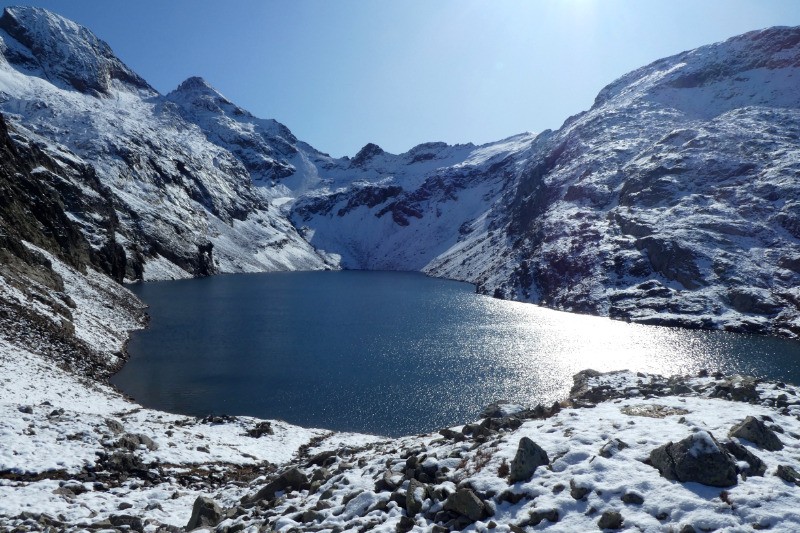 Superbe lac des Écrins, niché sous le Rochail. Un peu de neige au rendez-vous !