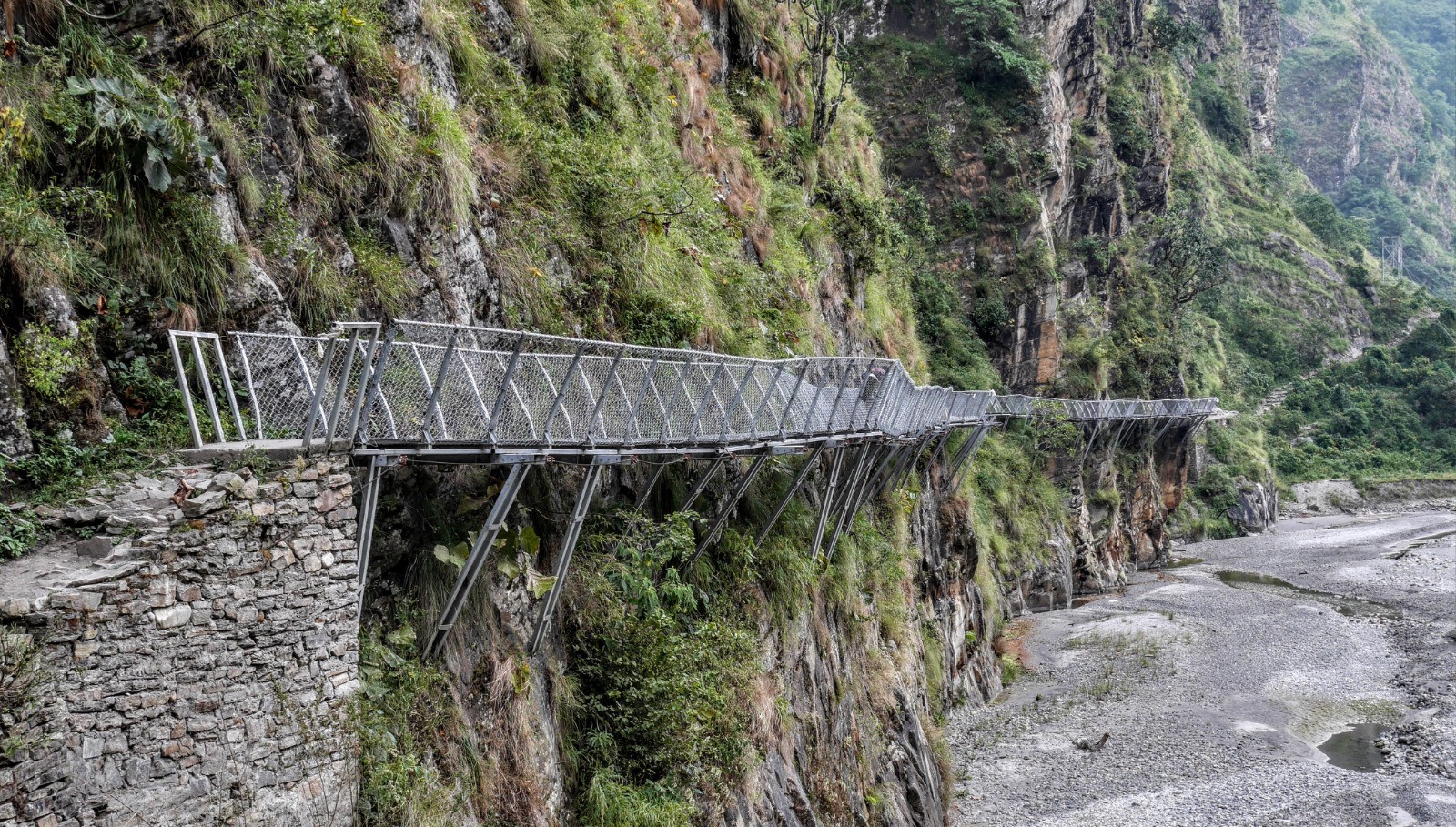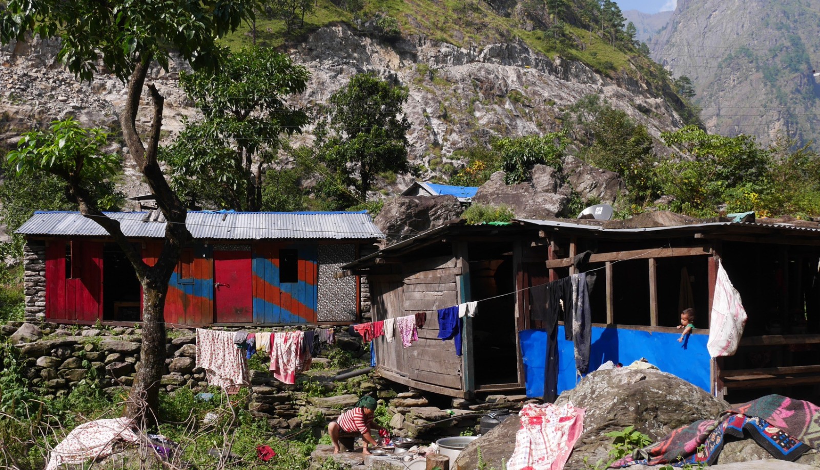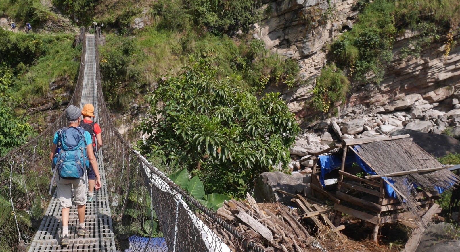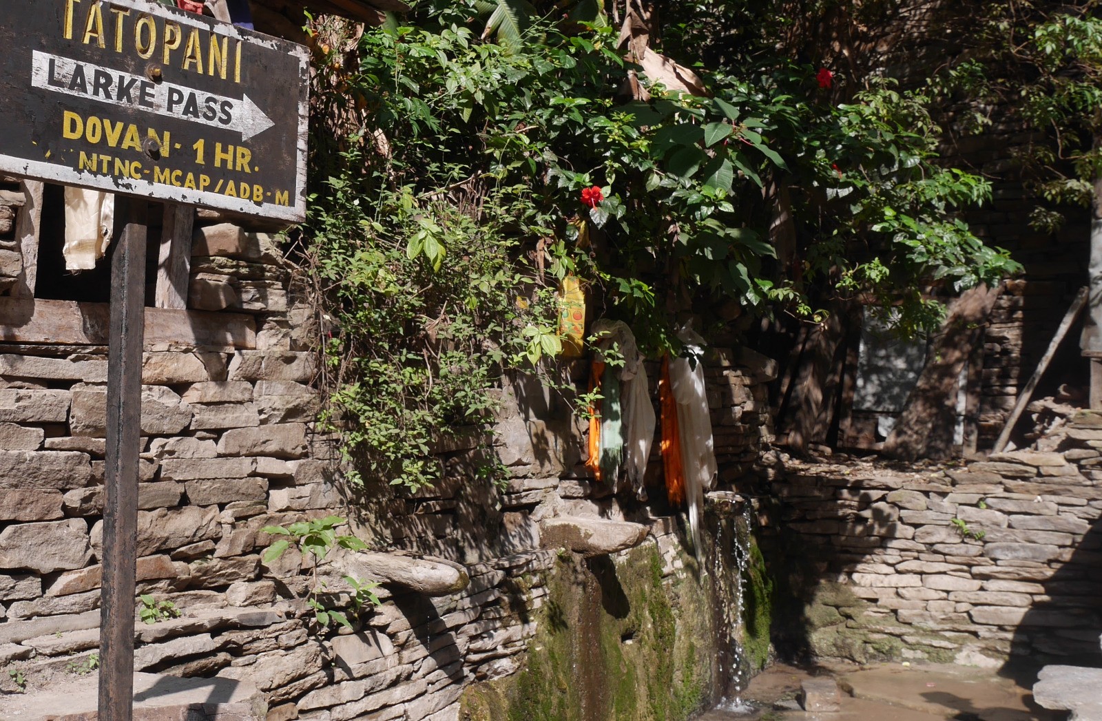 Au départ de la journée, il y a foule sur le chemin. Je discute avec le couple, dont le mec était dans les pomme, l'avant veille. Très sympa. Ils sont Roumains, et elle parle très bien français. Nous suivons toujours la rivière "Budhi gandaki" et nous passons plusieurs "ponts himalayens. Nous traversons Khola Besi et le village de "Tatopani" et ses sources d'eaux chaudes.Nous traversons et mangeons à Dobhan sous un grand soleil. Lieu sympa. L?après-midi est chaud et on se traine. Étape plus longue que la veille. Arrivée vers 16:00 à Jagat qui est un très joli village. Pas mal de touristes au Lodge, pas trop mal. Aujourd'hui pasta pour changer du Dhal Bhat et des Momos.