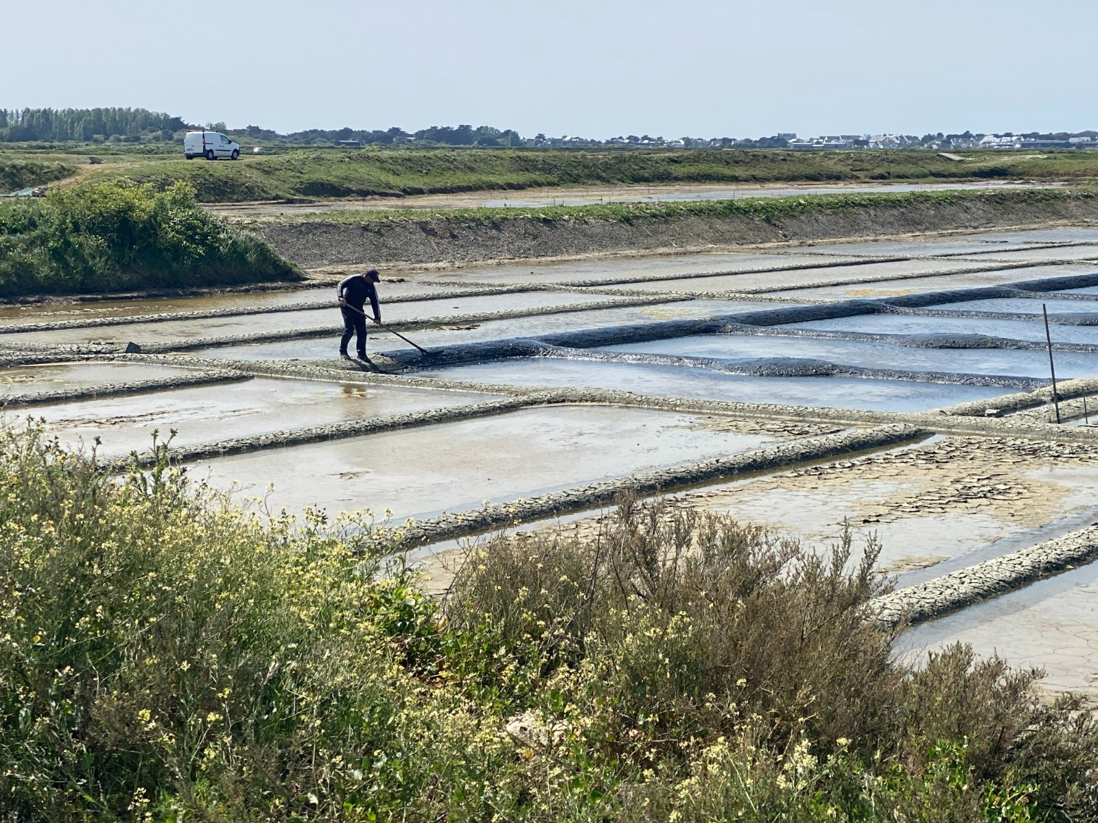 En ce moment les paludiers s'affairent au curage ( rayage ) des vasières et à l'entretien des talus ( renforcement, coupe de la végétation ).