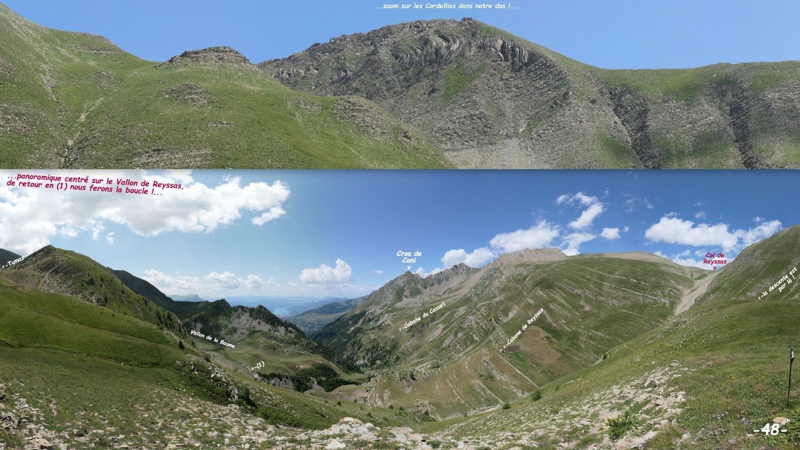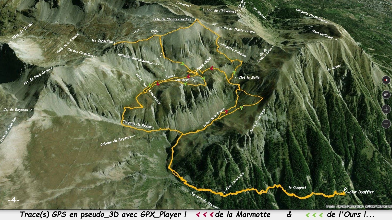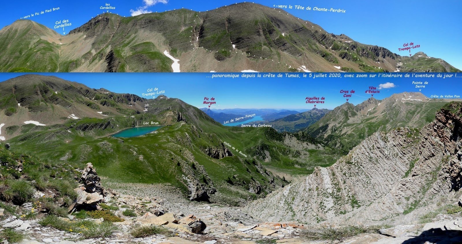 depuis Clot Bouffier, 1651m > le Cougnet > Clot l'Herbous > sentier du Col de Reyssas jusqu'à la sente du Vallon de la Baume, sentier pour le Lac Brun récemment balisé en jaune > le suivre jusqu'au Clot la Selle > montée sauvage à la Tête de Chante-Perdrix en suivant au mieux les pentes herbeuses plus ou moins raides de promontoire en promontoire avec les vues sur le lac et rejoindre la rive gauche de la dépression sous le Col homonyme puis en remonter la fine bande herbeuse jusqu'au sommet (c'est particulièrement facile et agréable !) > poursuivre par sa crête Nord-Ouest jusqu'aux Cordellias (toujours aussi facile et ludique pour les plus véloces !) > pour apprécier à sa juste valeur la singularité de ce sommet, poursuivre jusqu'au maximum de ses possibilités techniques avec une extrême prudence le rocher n'étant vraiment pas sûr (certes il y a bien plus pourri en Embrunais, mais bon faites très attention, il n'y a pas de honte à renoncer, bien au contraire !) > revenir au collet au Sud de la bosse cotée 2627m > descendre plein Ouest la pente semi-herbeuse en s'aidant des grosses mottes > traverser dès que possible au pied du ravin à gauche pour rejoindre au mieux le balcon Est du Lac Brun (visite possible de toutes les bosses qui le ceinturent !) > descente de l'alpage de Tumas > traverser le Vallon des Comborsiers > poursuivre en balcon pour le spectacle et rejoindre le sentier du Col de Reyssas en rive gauche du Torrent homonyme > retour à Clot Bouffier par le même itinéraire.