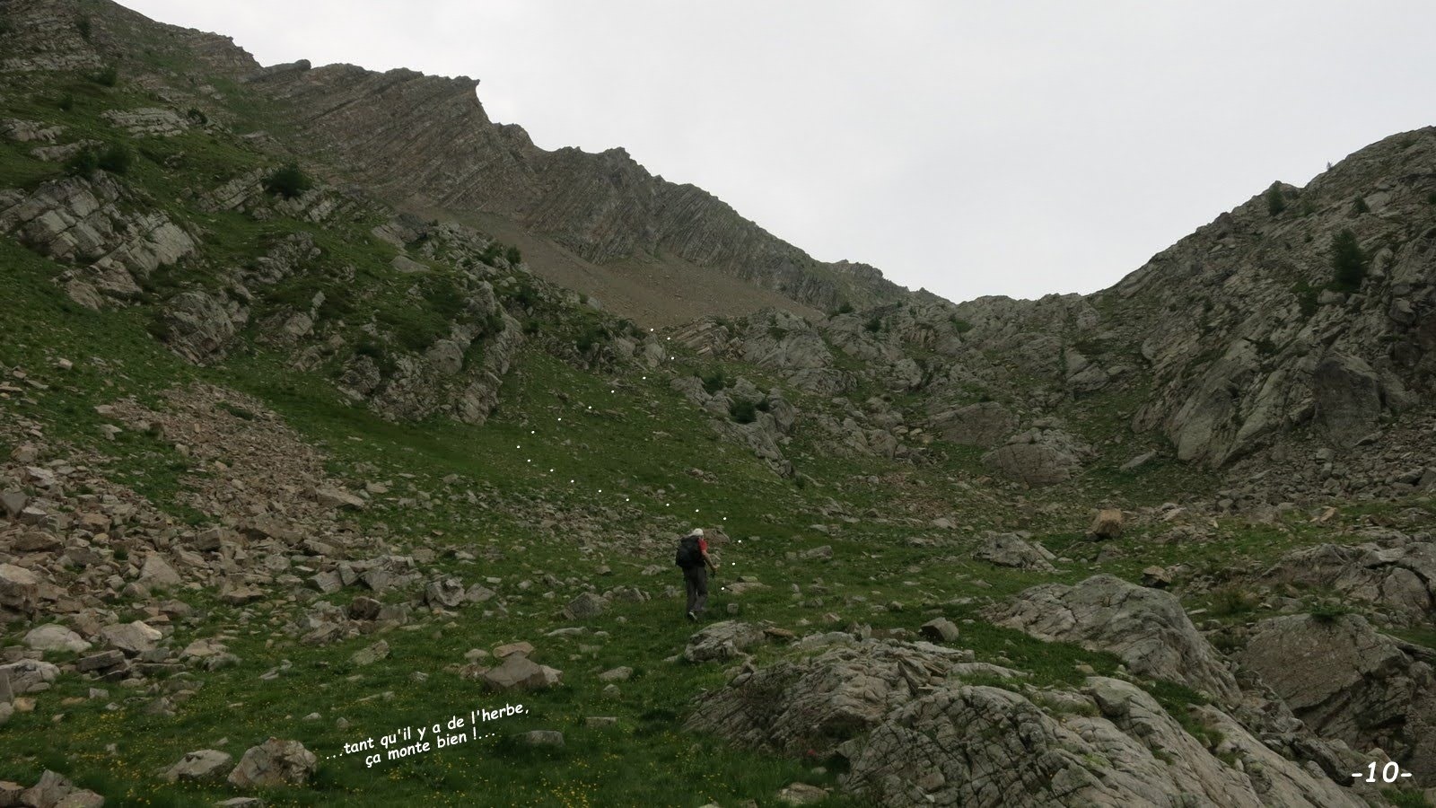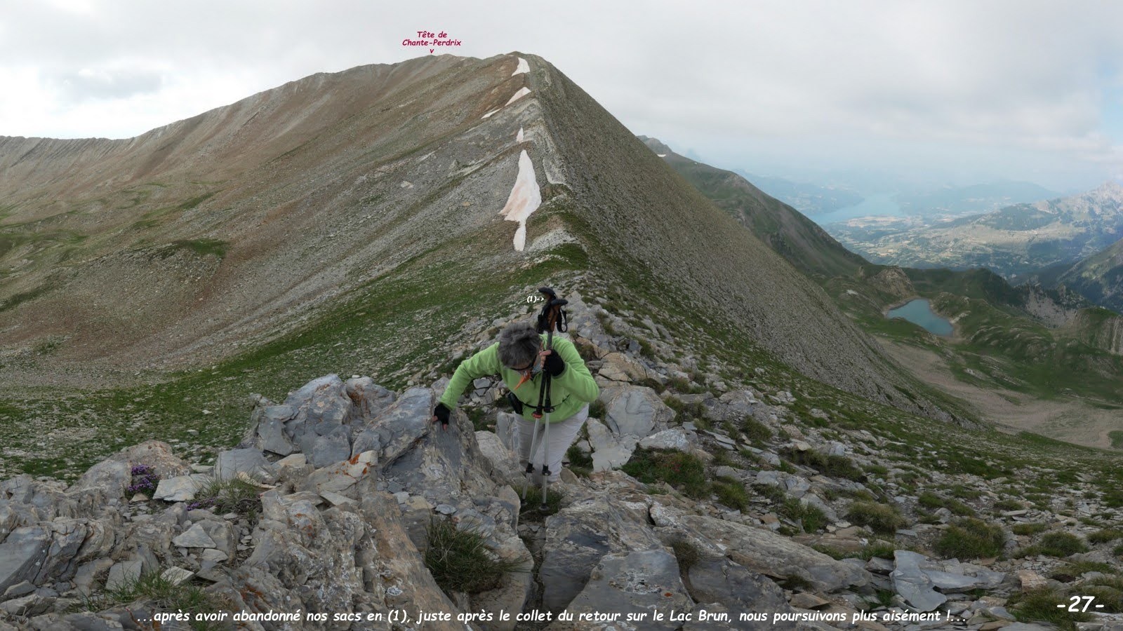 Trêve de plaisanterie ! et je dois avouer qu'en dehors de la partie escarpée de l'arête des Cordellias où j'ai préféré abandonner, cette boucle inédite, des plus sauvages, m'a bien plu; la crête Nord-Ouest de la Tête de Chante-Perdrix est très singulière, particulièrement facile (aussi large qu'un terrain de foot, paraît-il ?) et, cerise sur le gâteau, était des plus fleuries, un régal ! dommage que la météo n'était pas des meilleures sinon je m'y serais agréablement attardée. La montée par Clot la Selle et la succession d'éperons rocheux et pentes herbeuses qui ont suivi, avec les différents points de vue qu'ils offrent sur le Lac Brun et tout aussi intéressante et la Tête de Chante-Perdrix est déjà un très beau 360°.