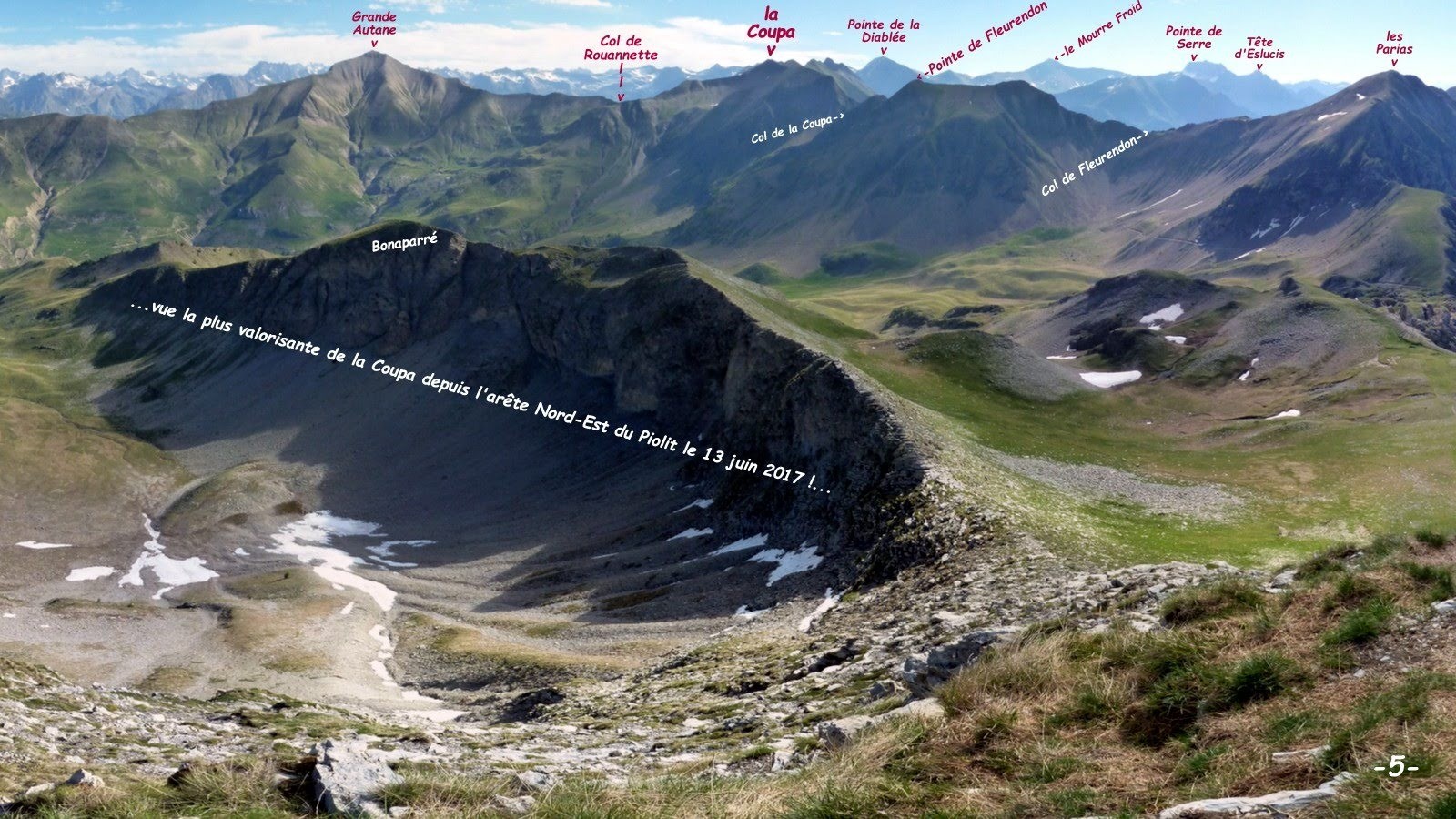 La Coupa, sommet peu individualisé de la longue crête qui va des Parias à la Pointe Reyna, même pas coté sur l'IGN, est la coqueluche des skieurs de randonnées alpines. Avec sa grande soeur l'Aiguille, elles constituent le véritable totem du ski de randonnée de la Station d'Orcières-Merlette et même bien au-delà ! sa pente plus douce en garantit l'affluence ; bien moins fréquentée par les raquettistes et encore moins par les randonneurs pédestres malgré la présence d'un bon sentier, balisé par de nombreux cairns en versant nord, la solitude est quasiment certaine en versant sud où les pentes sont bien plus sévères, jusqu'à 40° pour les 100 derniers m de dénivelé de l'accès à son antécime sud-ouest au-dessus de la Cabane du Vallon. Toutefois l'ambiance et le grandiose panorama que nous offre ce parcours de crête jusqu'à l'antécime et même "d'arête" ensuite jusqu'au sommet si l'on s'amuse à en suivre le fil, nous récompensent, me semble-t-il, pleinement de l'effort consenti jusque-là !