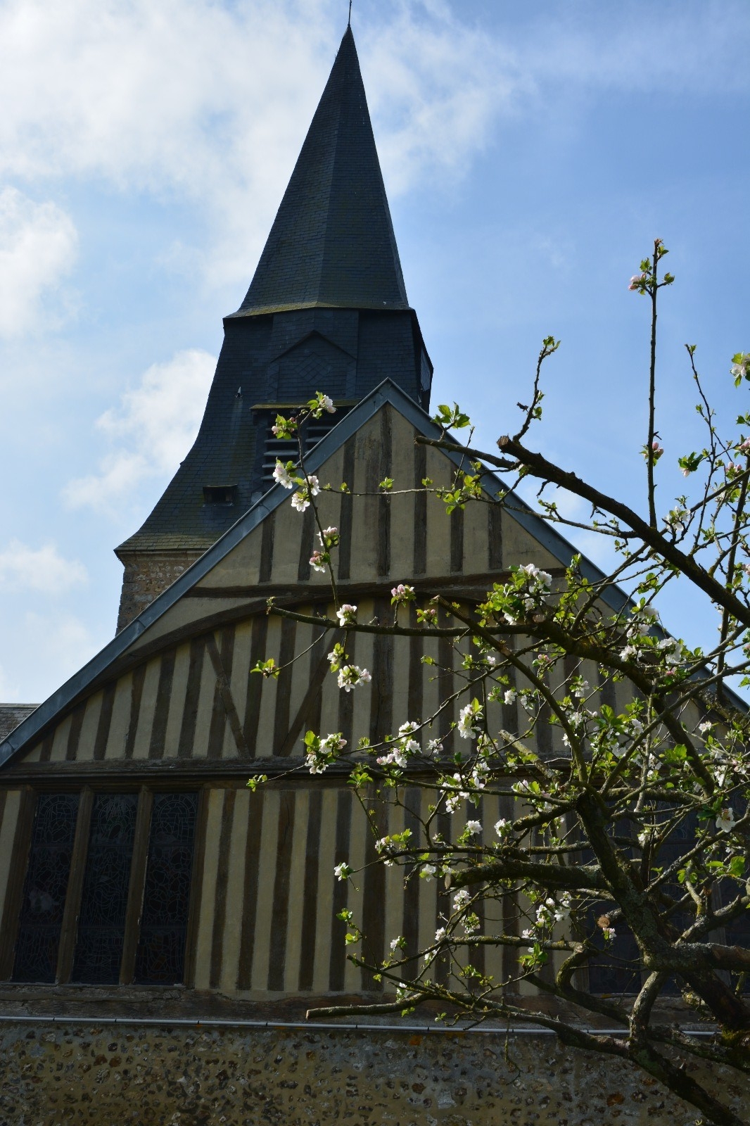 Départ à pied depuis le Camping des Pommiers Pays d’Auge. Cette randonnée entre villages, prairies et bois permet de voir de jolies chaumières et le bourg de Cormeilles dont l’église a une particularité unique en Normandie : laquelle ?